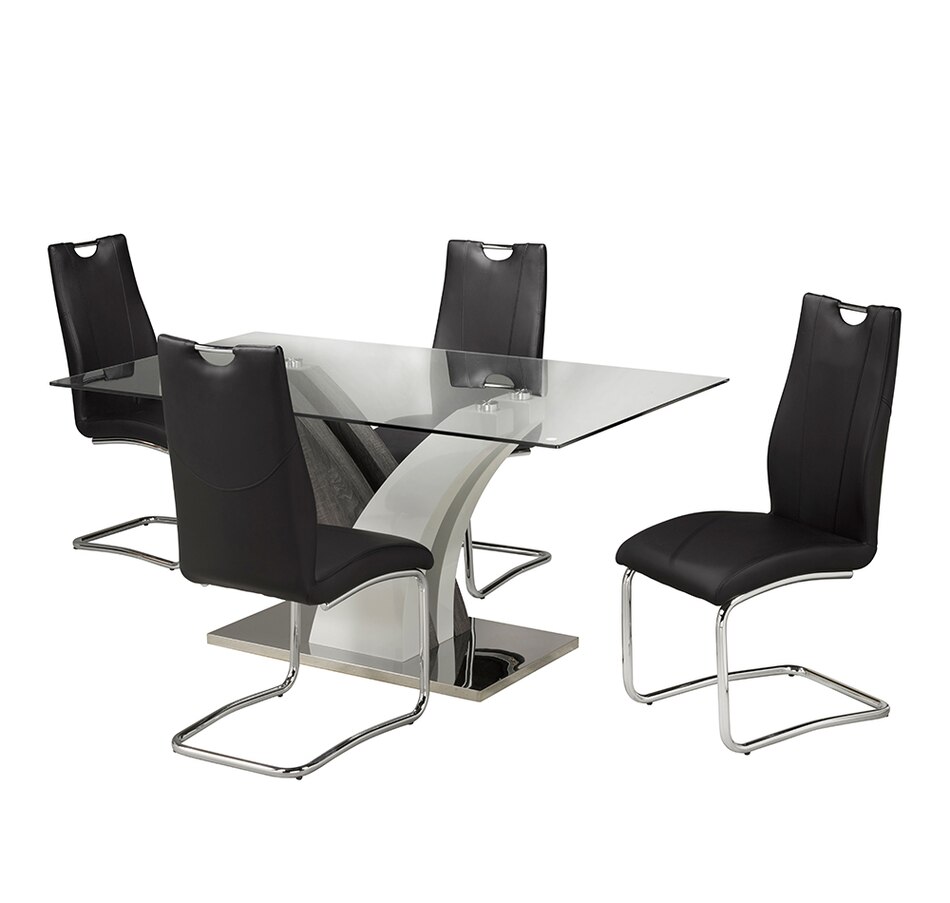 With its contemporary styling and unique table pedestal design, this dining set from Brassex is a striking centrepiece for your dining room and all your get-togethers. Durable and striking, this will be a treasured and preferred place for all your favourite meals, whether its a formal occasion or something more casual.