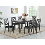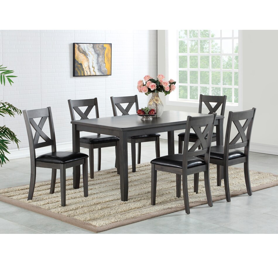 With its contemporary grey colour scheme, the versatile Gabriel dining set is an attractive addition to any modern home. Boasting one table and six chairs, this seven-piece set provides plenty of space for hosting casual family meals or elegant dinner parties. The table and chair frames are made from durable mango wood solids and veneers that stand up well to regular use. The comfortable cushioned chair seats are covered in a stylish faux-leather material that can be easily cleaned as needed. Designed to provide support while catching the eye, the X-back chairs are an elegant updated take on a farmhouse classic.