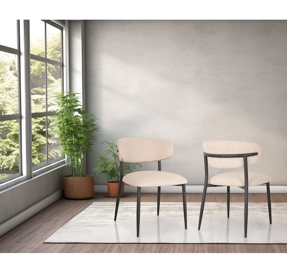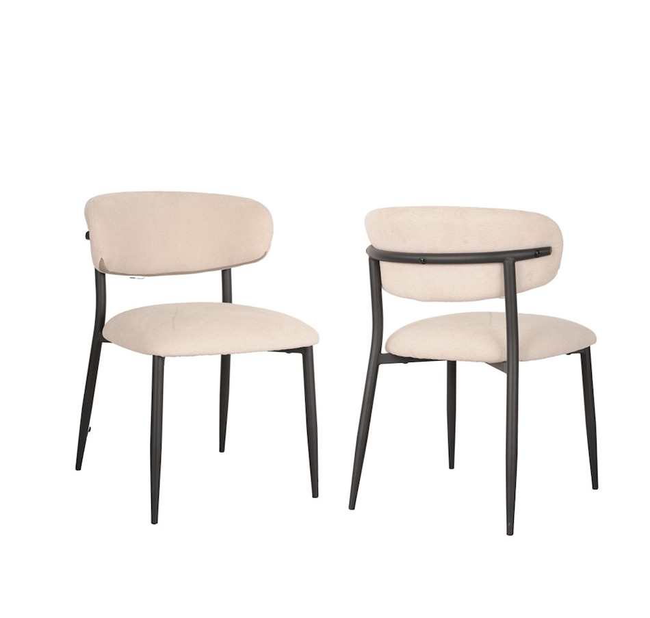 Introducing the Georgia chair, which enhances your dining space with elegance and modern appeal. This set includes two beautifully designed chairs, perfect for creating a stylish and cohesive look in your dining room. They effortlessly complement a variety of interior design themes, adding a touch of sophistication to your space. The curved back provides optimal comfort and support during meals and gatherings. This ergonomic design encourages proper posture and allows you to relax and enjoy your dining experience for extended periods. The splayed powder coated legs of the chair not only contribute to its modern aesthetic, but also ensure stability and durability. The Georgia is upholstered in premium fabric, offering a luxurious feel and a soft touch. The neutral beige adds a warm and inviting element to your dining area, effortlessly blending with a range of color palettes.