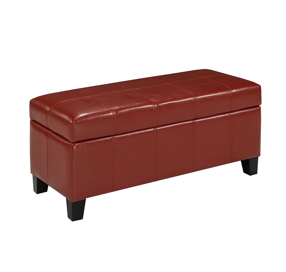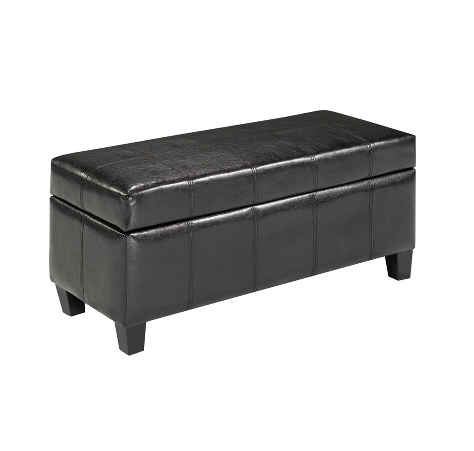Combine handy storage and fabulous decor with this ottoman piece from Brassex. It features a slim profile, generously padded top with a rich fabric cover, and an ample interior storage space.