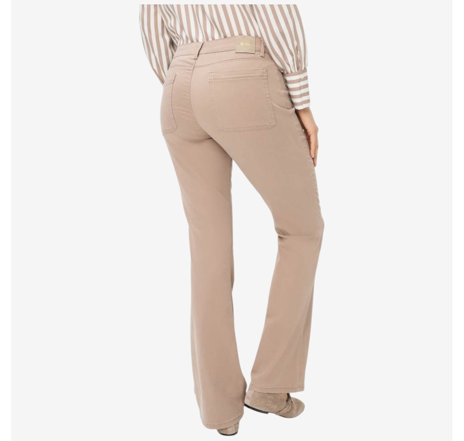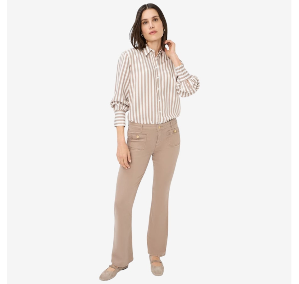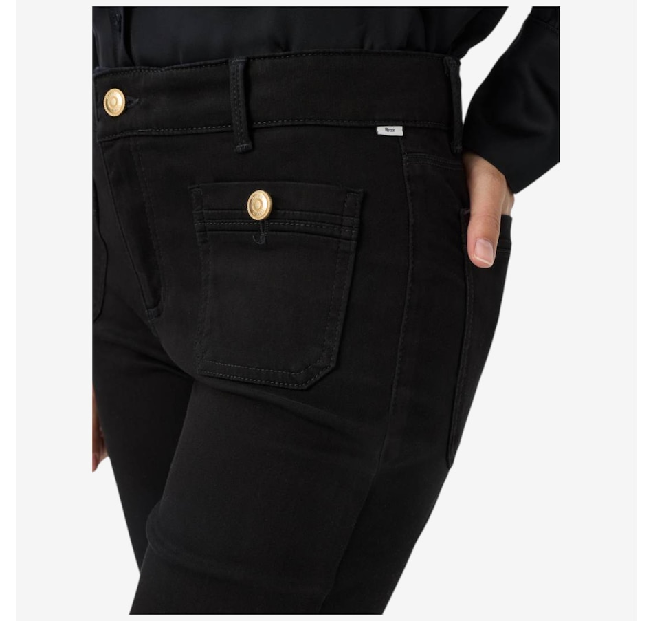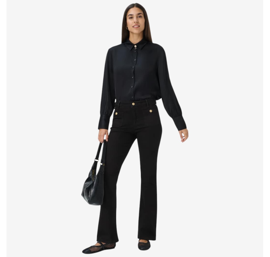 This is the Shakira cotton dream trouser: slim with a slightly flared bootcut for a feminine, modern silhouette. Patch back pockets, slash pockets, and decorative gold buttons give classic five-pocket style a sophisticated update. Crafted in cotton dream satin blend, it is luxuriously soft, has a gentle stretch, and retains its shape beautifully. Available in autumnal hues, the
