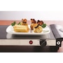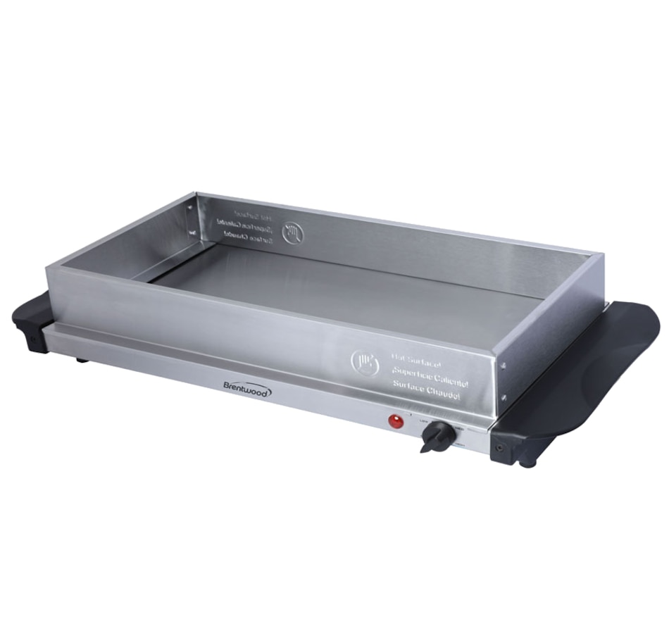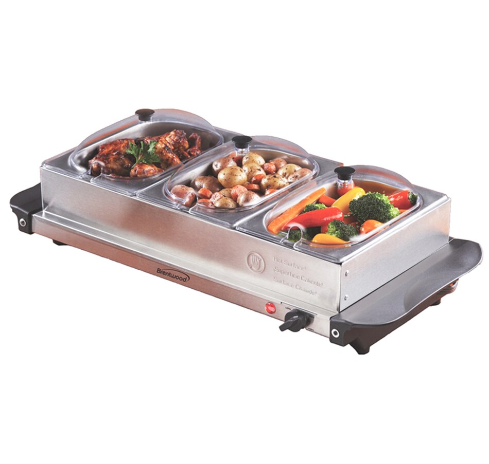 The Triple Buffet Server and Warming Tray comes with three generously sized 1.5 quart buffet pans. Enjoy 3 way adjustable heat - low, medium and high. Remove the buffet pans and water tray to use as a 9" x 17" warming tray for finger foods. Food contact parts are made from food grade stainless steel for ultimate durability. Powerful 180 watt buffet server keeps food warm for hours. Cool-touch side handles let you easily relocate the food warmer. Clear domed lids are highly durable, heat resistant and have spoon cut outs for serving convenience. Power indicator light illuminates when unit is powered on. Brentwood Appliances offers a one year warranty from date of purchase to repair or replace any defective unit.
