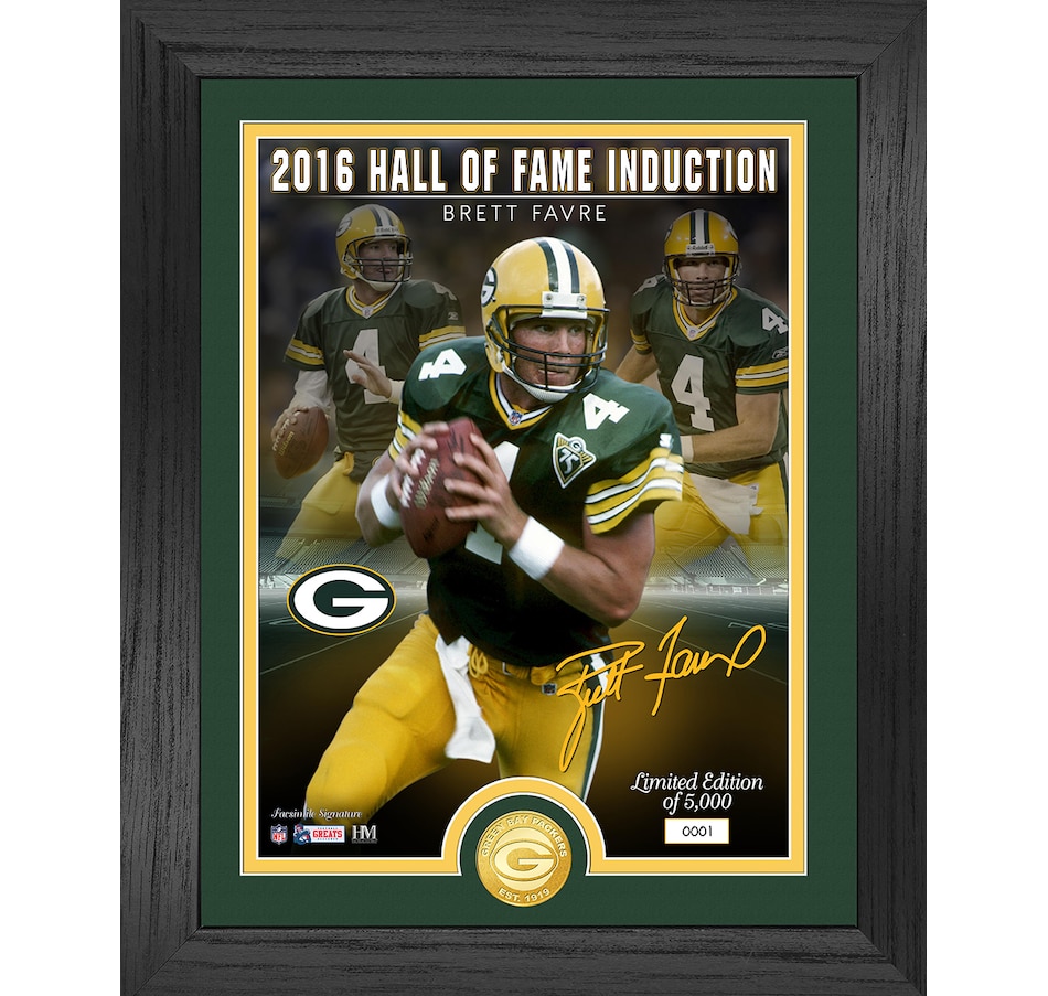This is a limited edition collectible frame featuring an exclusive photo of Brett Favre with a minted Green Bay Packers coin. The 13" x 16" wood frame with double matting under glass features a custom three-image 8.5" x 11" photo of Brett Favre in action, with his facsimile (replica) signature. Each photo is hand numbered and matted with a 39mm solid bronze minted team coin. Available in a limited edition of only 5000 and officially licensed by the NFL and NFLPA, each signature photo mint is accompanied by a certificate of authenticity. This product is proudly made in the USA by The Highland Mint!