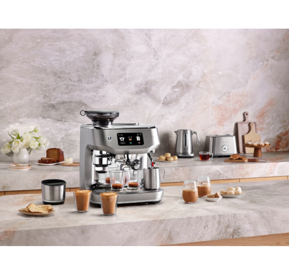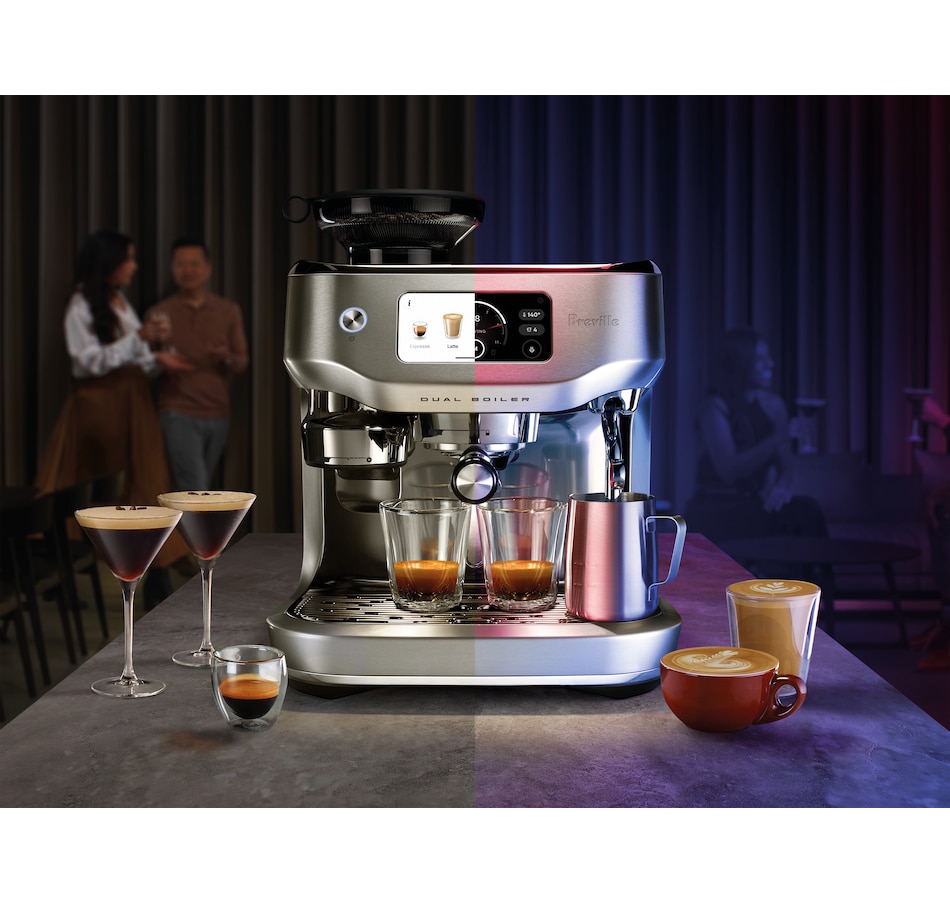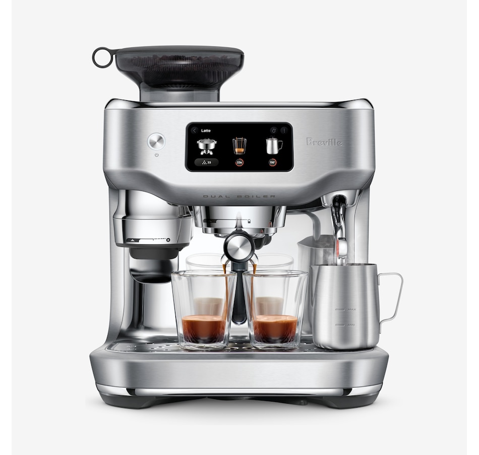 This espresso machine from Breville features a powerful quad-core CPU that enhances the highly responsive 5.7-inch touchscreen, letting you switch between two modes: sit back and relax on Auto or take control in Manual. You can enjoy an authentic café experience at home with powerful stainless steel dual boilers for simultaneous extraction and steaming, and the new Auto Dial-In system monitors each extraction and helps to improve your next espresso shot. Auto MilQ delivers silky microfoam hands-free, with settings optimized for dairy, soy, almond and oat, and you can also use the new Breville Coffee app to remotely power on and pre-heat your machine.