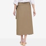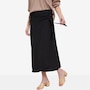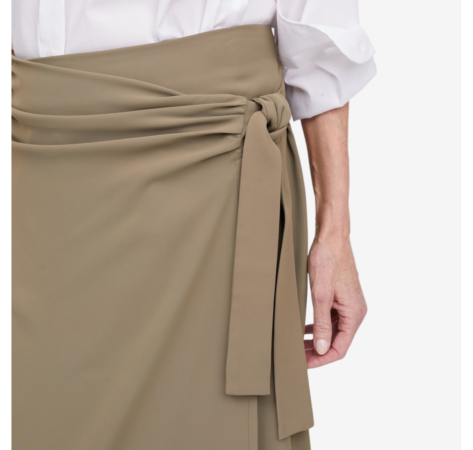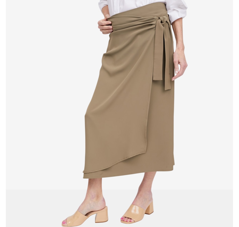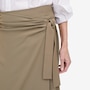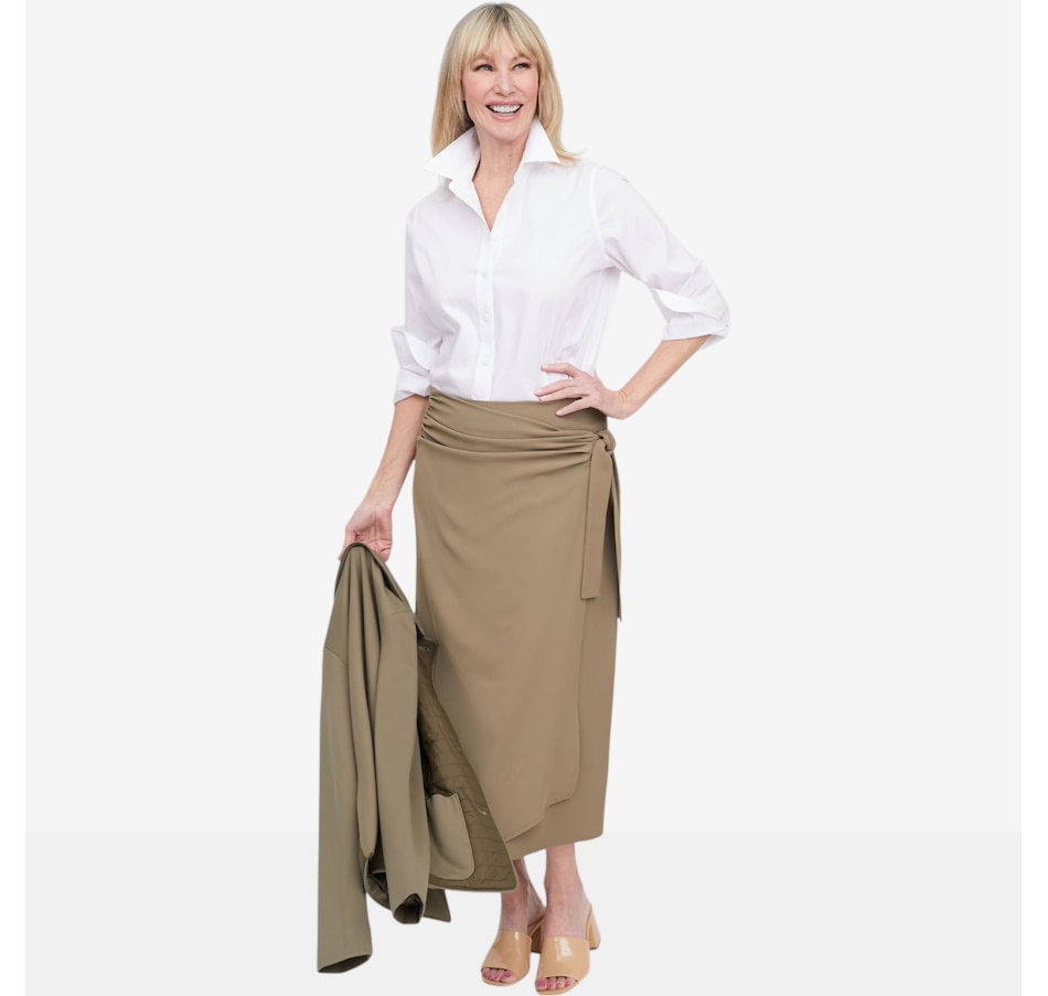 Bring effortless elegance and modern flair to your wardrobe with this beautifully gathered wrap skirt, a chic, feminine piece designed to flatter from every angle. The drop‑waist silhouette features soft side ruching that adds texture and shape, while the angled front hem creates a stylish, contemporary finish. A secure button closure and side‑tie detail give the skirt its classic wrap look, allowing you to adjust for comfort and definition. With a contour waistband and clean 1/4" top‑stitching, every detail is crafted for a polished, versatile finish.