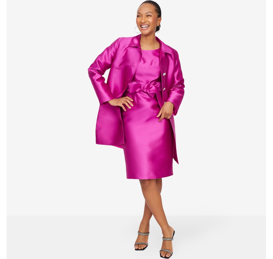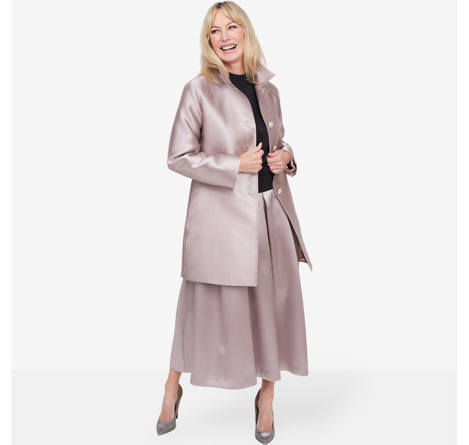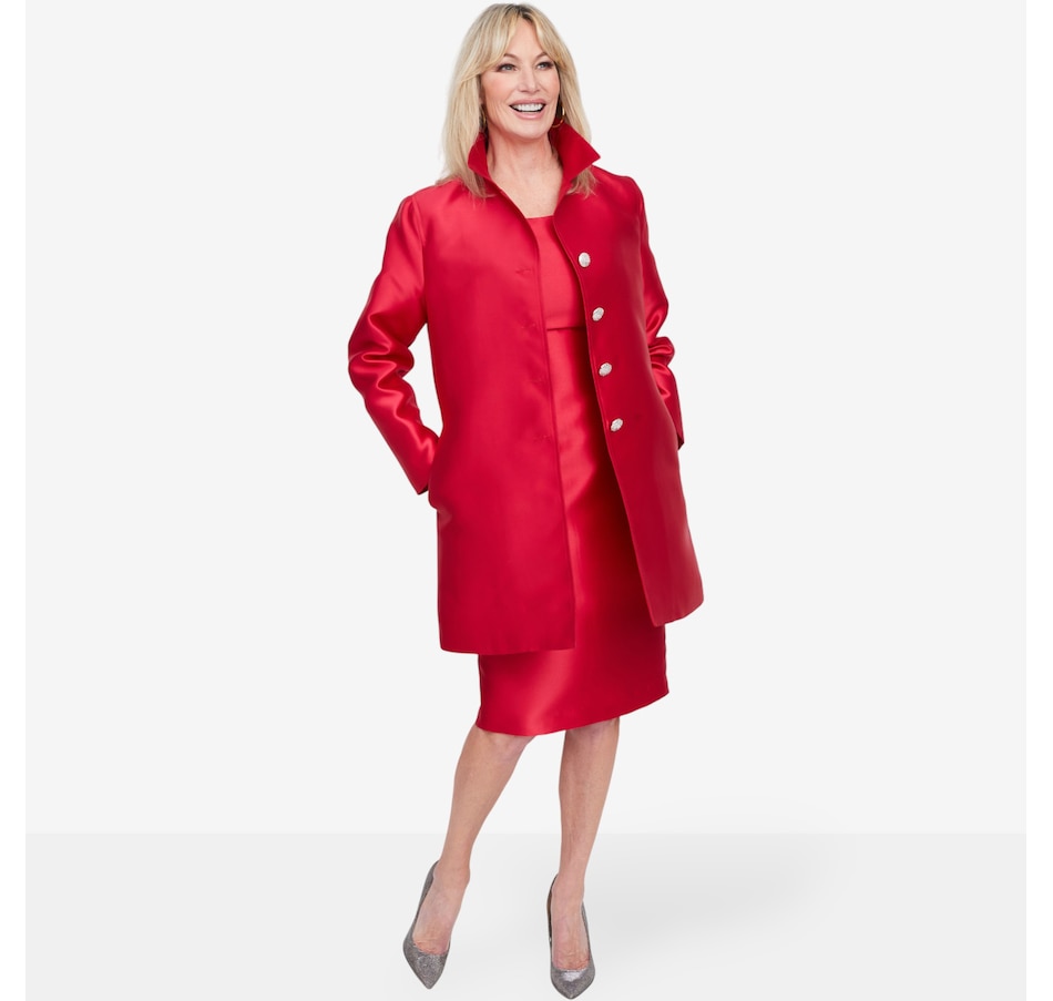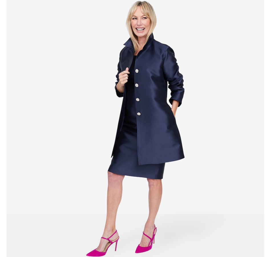 Make a statement of colour and confidence with the Brian Bailey Mikado topper, a luxurious layer that blends structure with sophistication. This long sleeve topper features a stand collar, button front, and tailored shoulder pads for a polished silhouette. The relaxed fit and practical pockets add ease to its elegance, while the full lining means comfort and quality. Available in a stunning array of colours, it’s the perfect piece to elevate your wardrobe. Style it with slim trousers, a fitted sheath dress, or wide-leg pants for a chic, modern look that transitions effortlessly from day to evening.