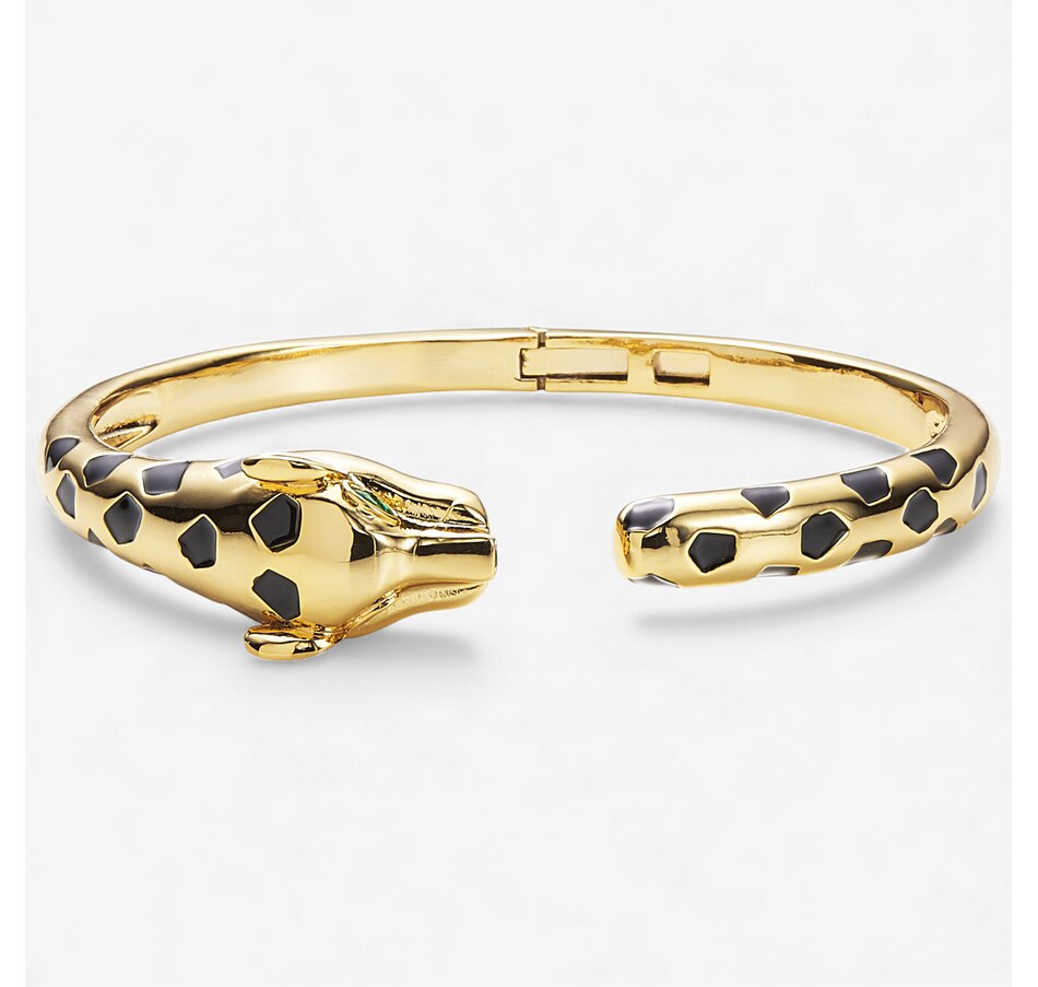 18K Yellow Gold Plate Back Hinged Panther Bangle with Black Enamel