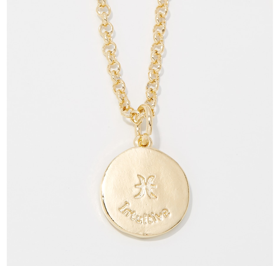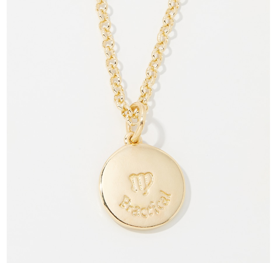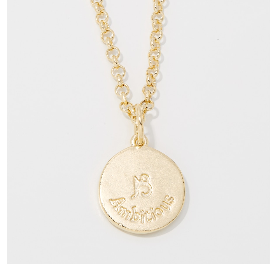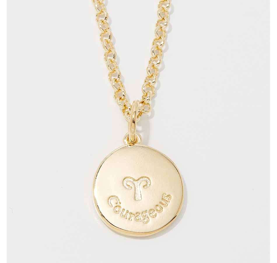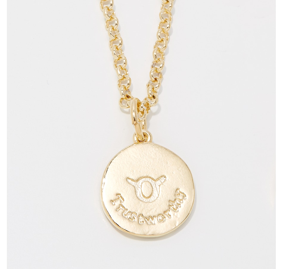 Inscriptions of back of pendants are as follows: Aquarius (Friendly), Pisces (Intuitive), Aries (Courageous), Taurus (Trustworthy), Gemini (Intelligent), Cancer (Imaginative), Virgo (Practical), Libra (Charming), Scorpio (Passionate), Sagittarius (Optimistic),