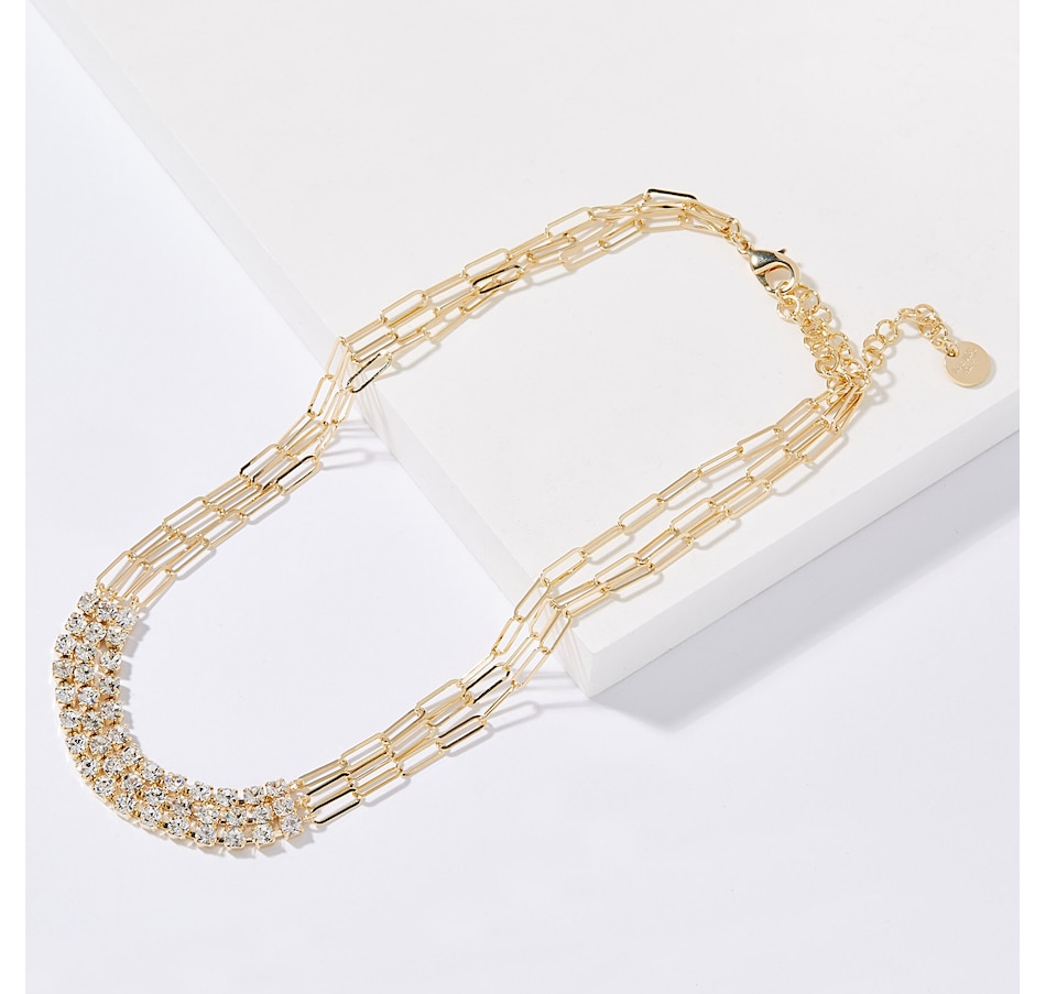 Yellow Gold Crystal Tennis Necklace on Multi Strand Paperclip Chain