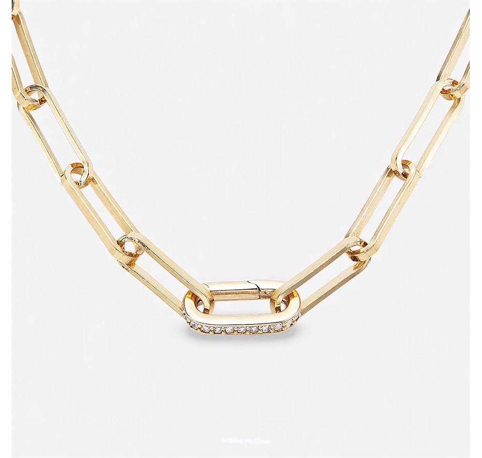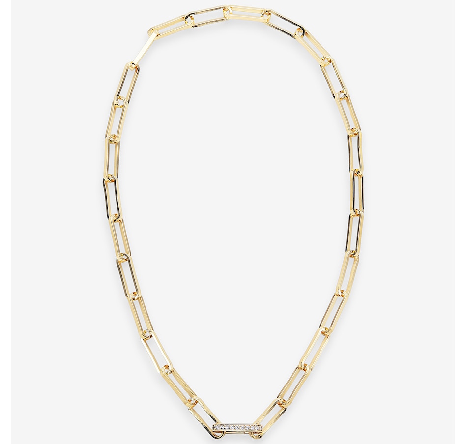 Add effortless sophistication to your look with this yellow gold plated large paperclip chain necklace. Crafted from durable bronze and finished with a rich, high-polish shine, this piece is designed to make a statement. Measuring 18 inches in length, its bold paperclip links offer a modern, versatile style that pairs beautifully with any look. A sparkling cubic zirconia clasp adds a touch of brilliance, elevating this necklace from simple to stunning. Secured with a link clasp, it combines elegance with everyday wearability. Perfect for layering or wearing solo, this necklace is your go-to for chic, contemporary glamour.