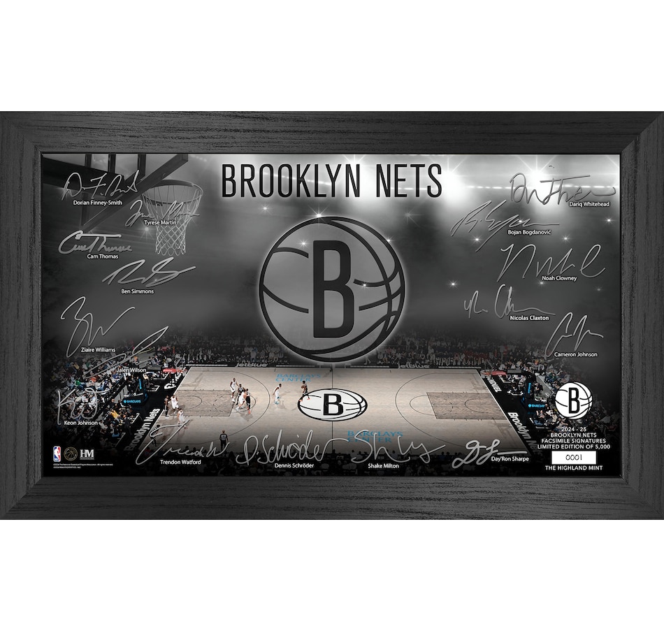 This Signature Court print features facsimile signatures of the Brooklyn Nets roster displayed around their home court. Each print is hand-numbered and comes in a 12" x 20" wooden frame with an acrylic glass front panel.