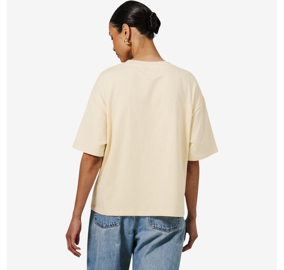Effortlessly cool with a nostalgic feel, this boxy tee is the everyday go-to that feels like a worn vintage favourite. Crafted from 100% cotton, it features a wide‑cut, boxy silhouette that hits right at the hips for relaxed, easy wear. Elbow‑length sleeves add a modern edge, while the classic crew neckline keeps the look timeless. Finished with ribbed detailing at the neckline, cuffs, and hem, plus durable double topstitching, this tee is made to be lived in.