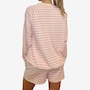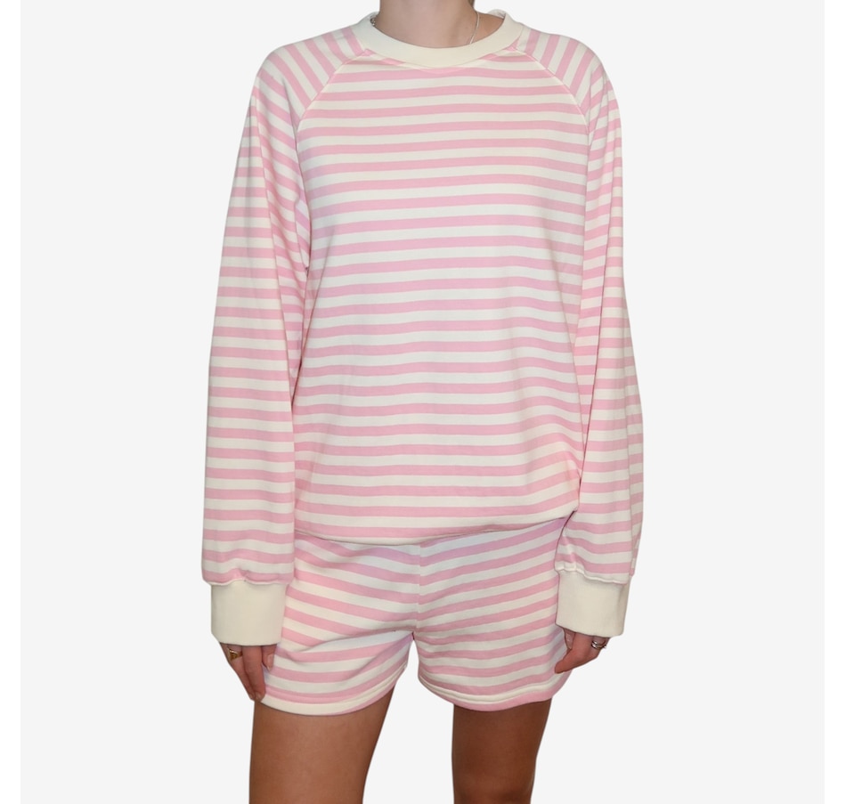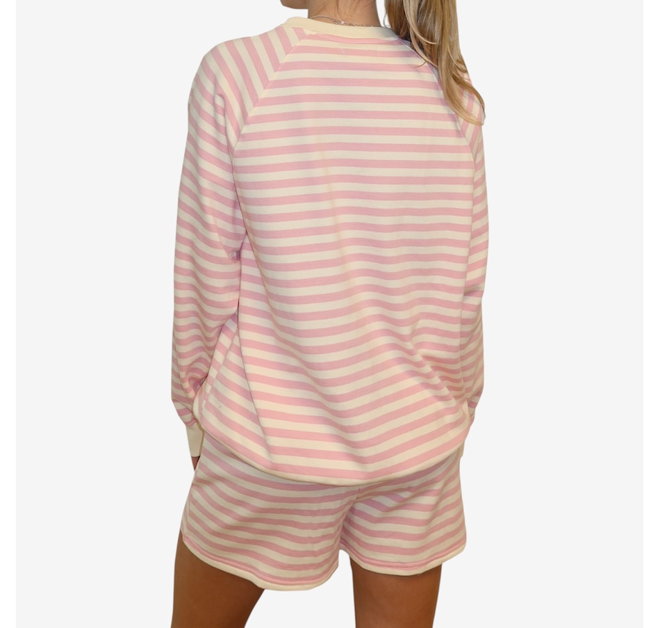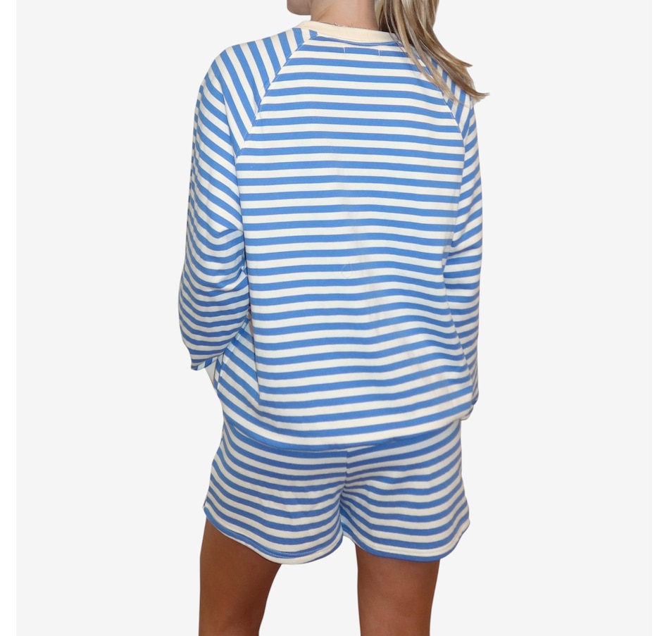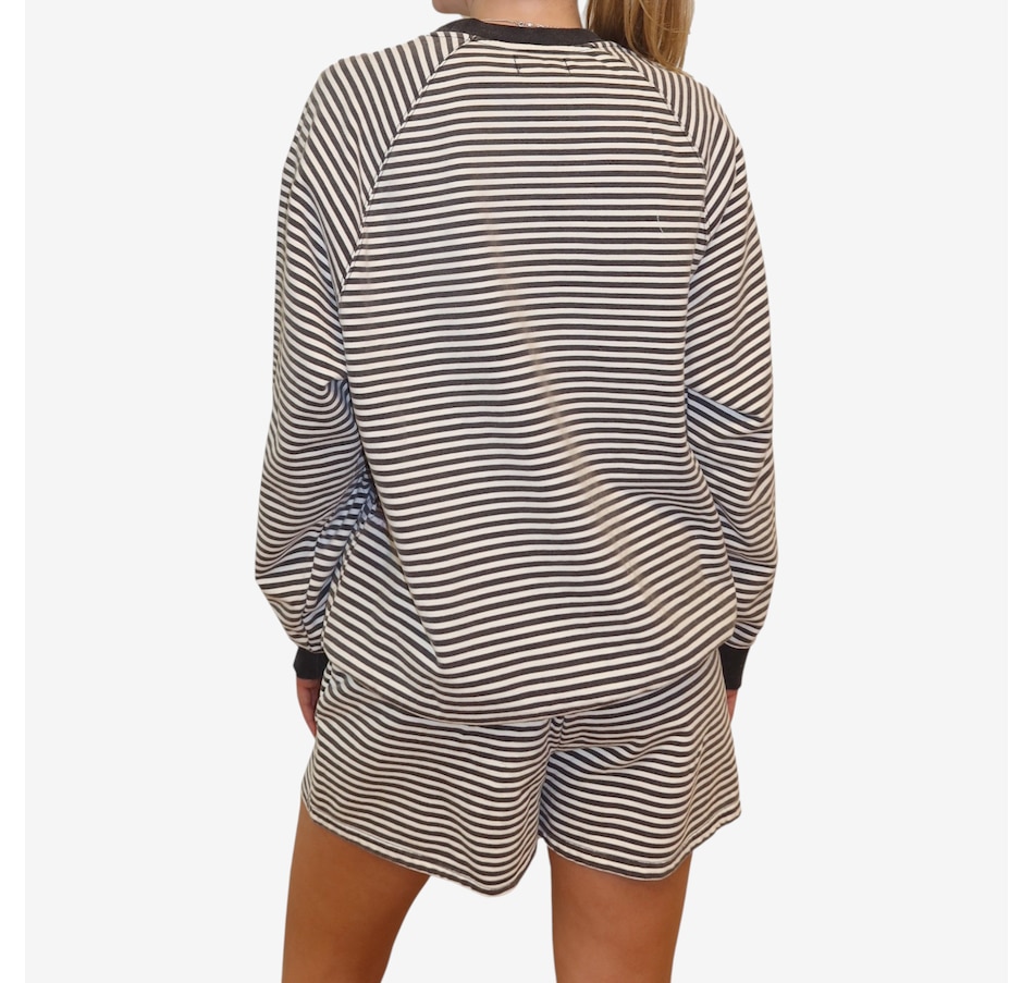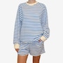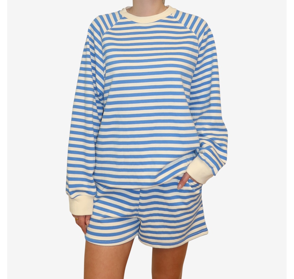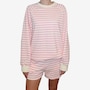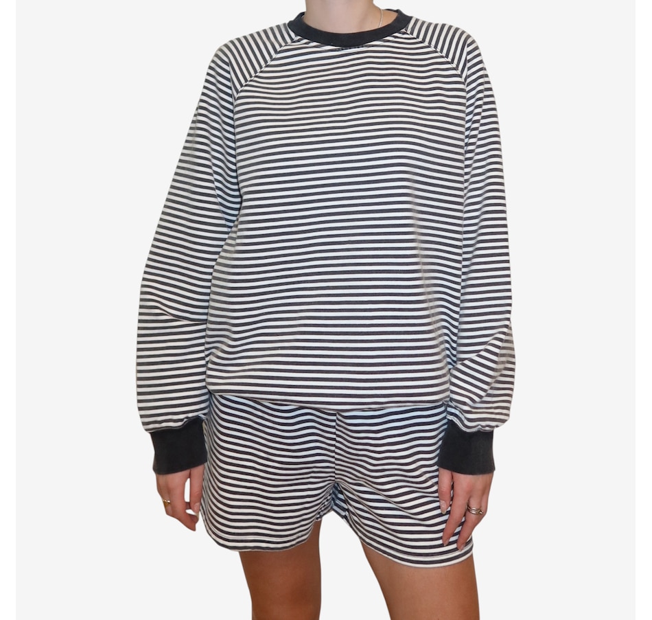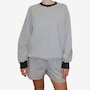 Wrap yourself in effortless spring style with this mini stripe crew from Brunette The Label. Stonewashed for a soft, lived‑in feel, this go‑to layering piece features an oversized fit with raglan shoulders and full, slouchy sleeves that strike a balance between relaxed and refined. Designed to hit right at the hip, it creates an easy silhouette that works just as well for lounging at home as it does for casual city strolls. Finished with washed black ribbed detailing along the neckline, cuffs, and hem, this timeless striped crew is endlessly wearable. Stick true-to-size for a perfectly oversized look, or size down for a more streamlined fit.