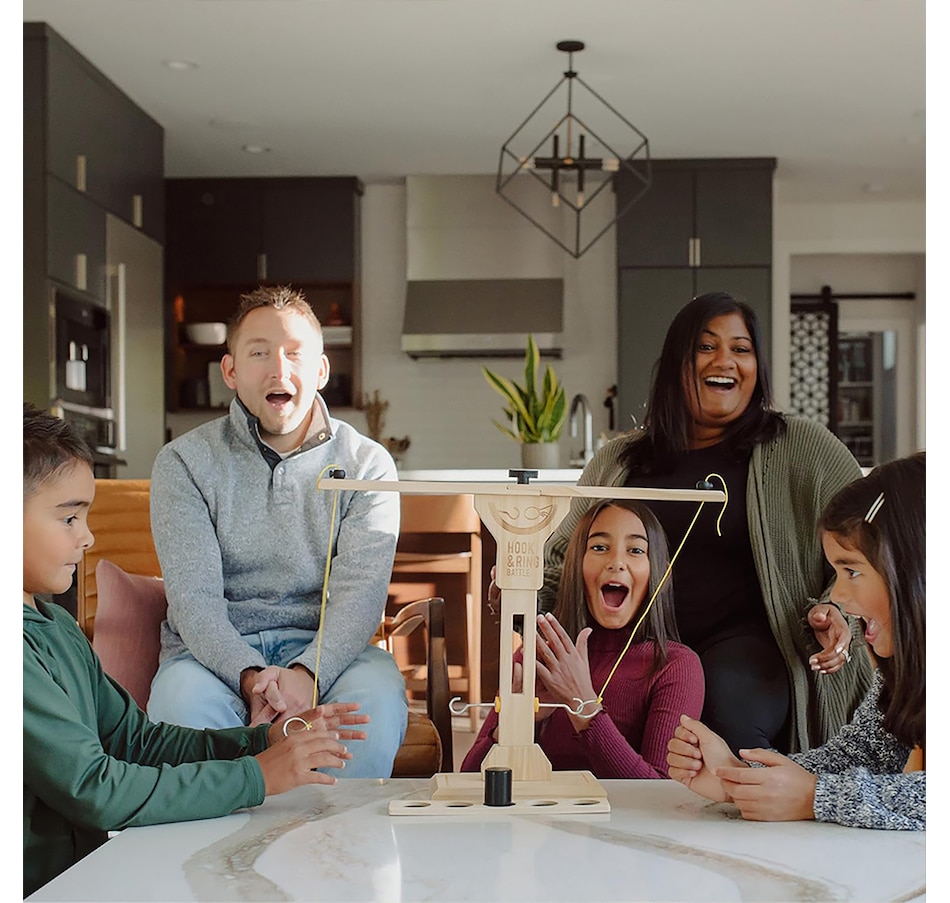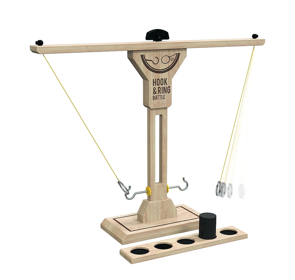 The Hook and Ring Battle game is the ultimate fast-paced party game! Go head-to-head against family and friends to land your ring on the hook as many times as possible, and as quickly as you can! When you hook your ring, you are one step closer to the win, but move quickly, because play doesn't stop and neither does your opponent! This game includes the hook and ring battle tower, a scoring ladder, scoring peg and instructions.
