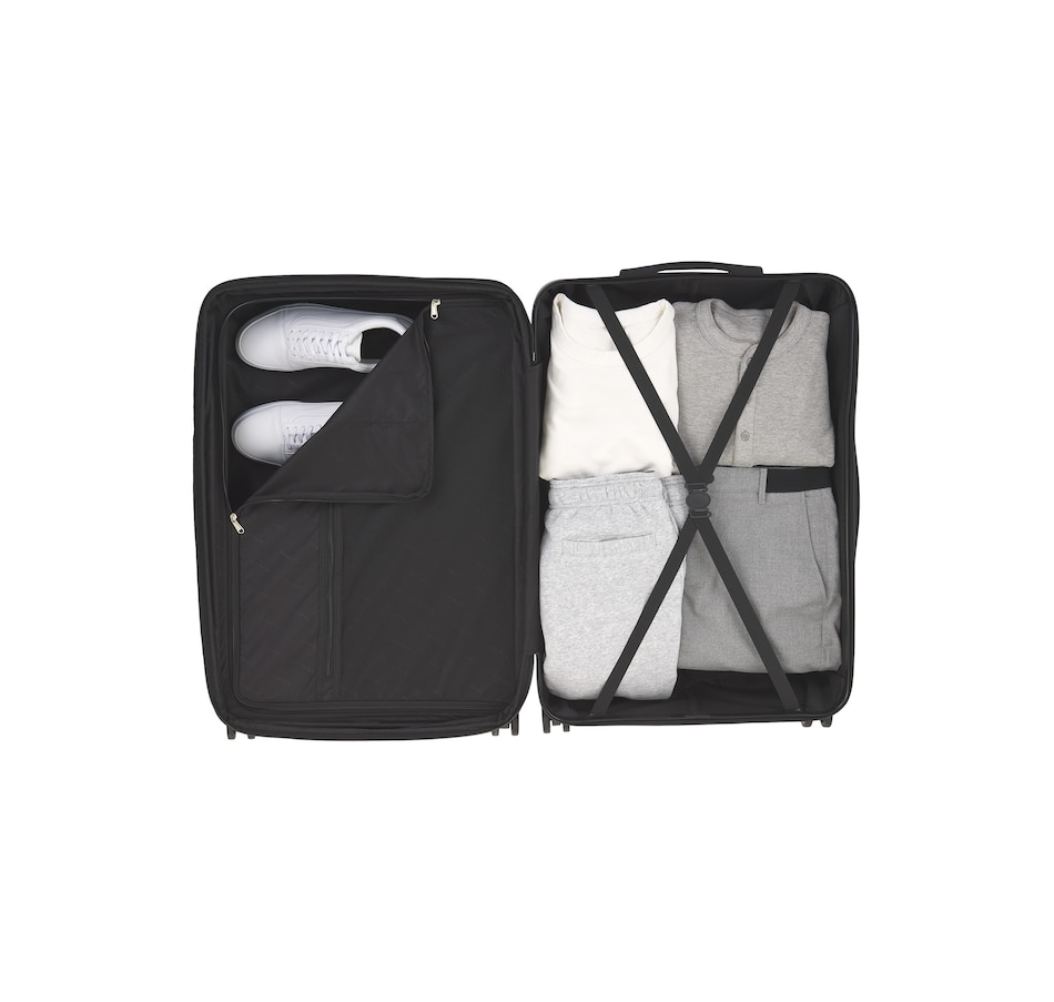 • Our suitcases feature a signature lined interior, complete with a dividing panel and tightening straps, ensuring your belongings stay secure.