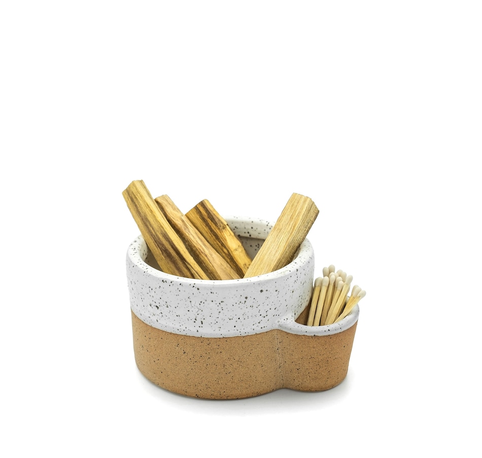The days of digging around in the recesses of cutlery drawer to find matches are behind you. Weaving together raw terracotta and speckled white glaze, this ceramic bowl displays your Palo Santo as well as matches or lighter keeping everything together while adding a classic element to your home decor.