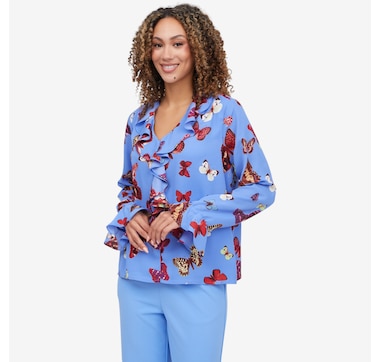 Step into chic, effortless sophistication with this printed lining crepe blazer from C Wonder, a beautiful piece designed to elevate your wardrobe from day to night. Clean, precise tailoring creates a sleek, elongated silhouette, while the classic notch lapel and two‑button gold closure add timeless polish. Dual front flap pockets provide functional elegance for everyday wear, and the fully lined interior with a playful printed finish brings a touch of personality to every outfit. With its slightly relaxed fit, this blazer strikes a beautiful balance between structure and comfort.