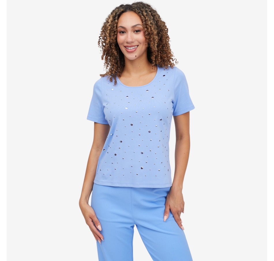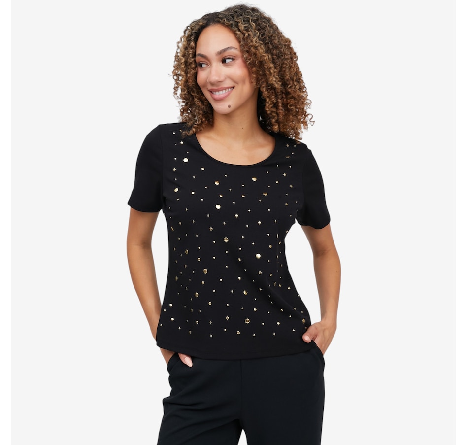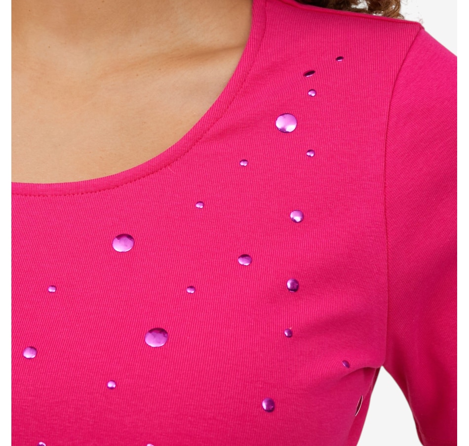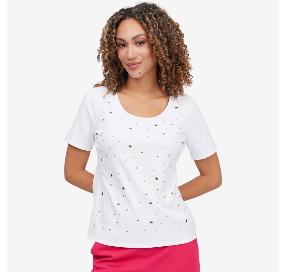 Add a touch of subtle sparkle to your everyday wardrobe with the heat‑set metallic dot elbow sleeve tee from C Wonder, a chic essential that blends comfort with refined glamour. Crafted from a soft stretch knit that gently skims the body, it maintains a clean, polished shape while offering all‑day ease. The heat‑set metallic embellishments create a delicate shimmer and beautiful dimension; eye‑catching without feeling heavy. A scoop neckline provides a flattering frame for layering or wearing solo, and the elbow‑length sleeves deliver modern coverage with a sleek, feminine line. Finished with a smooth bend‑back hem, this lightweight tee transitions effortlessly through the seasons.