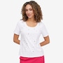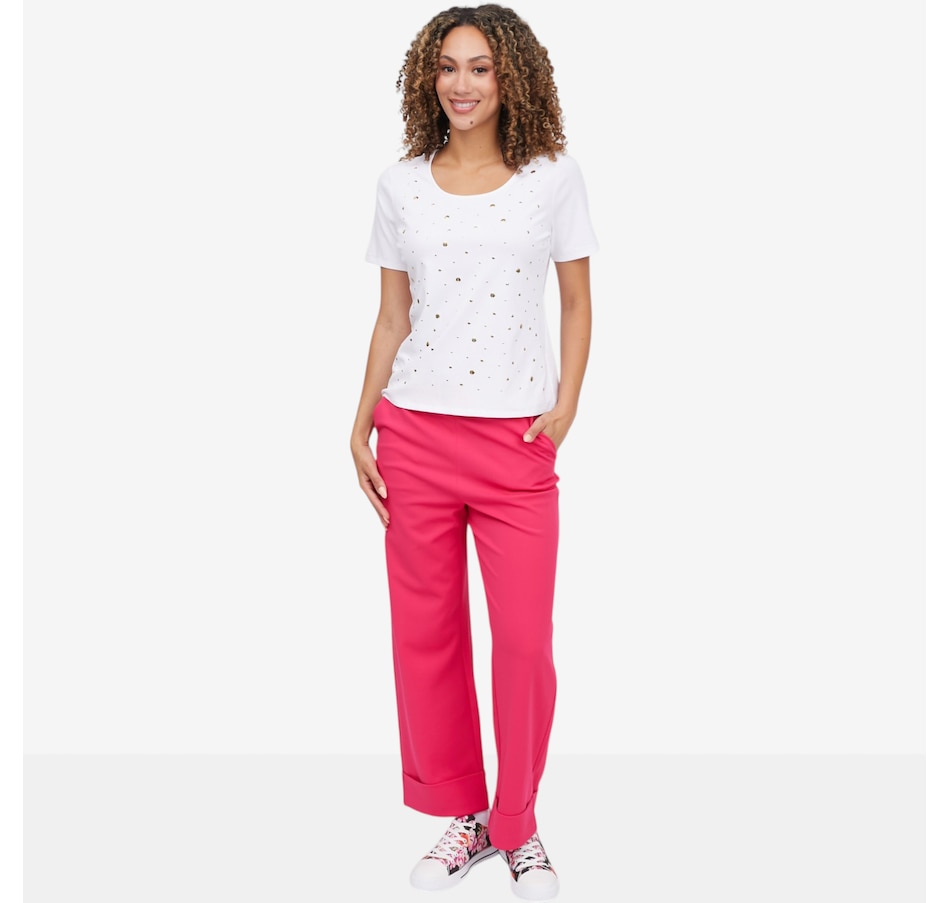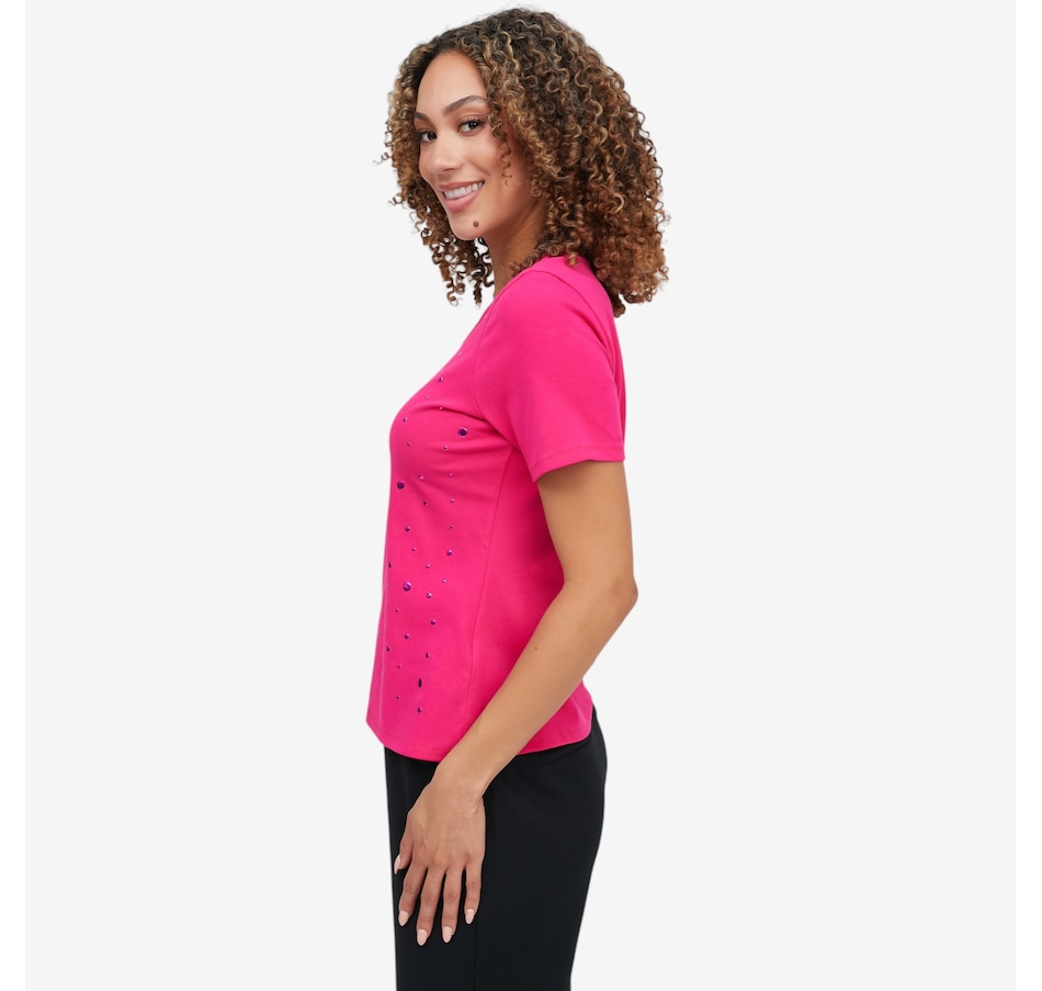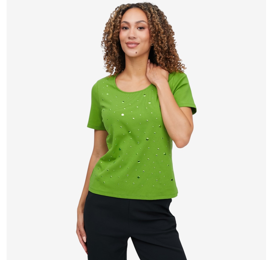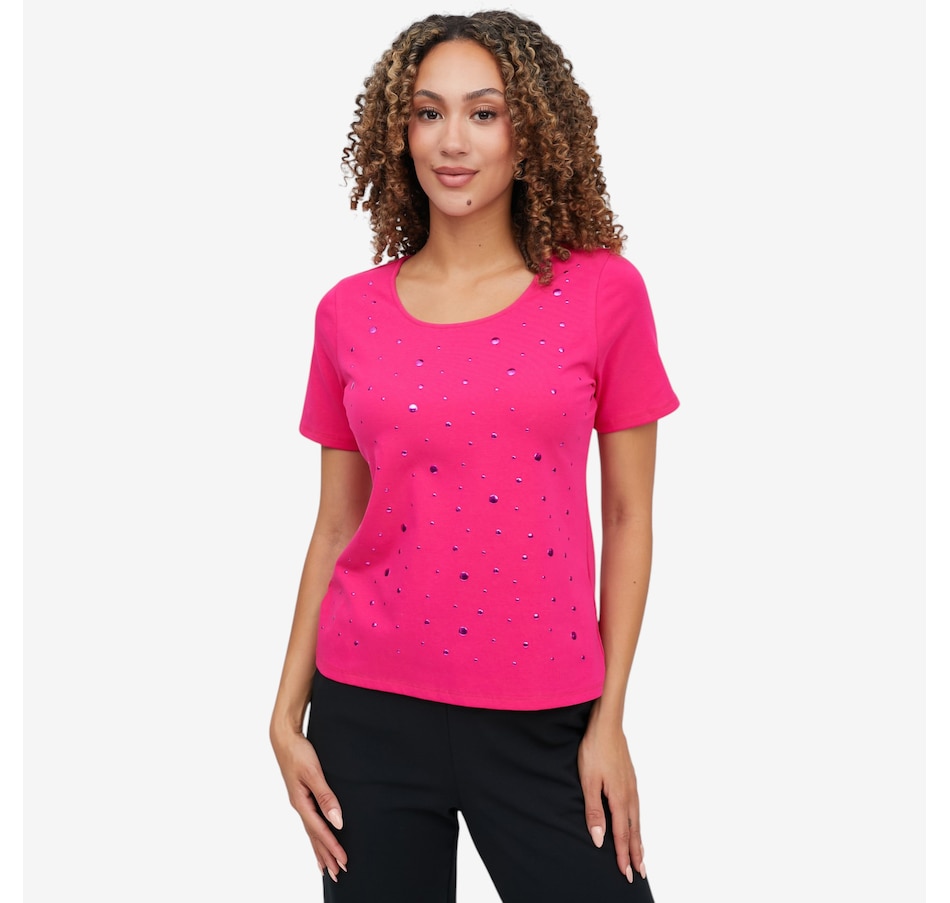 Add a touch of subtle sparkle to your everyday wardrobe with the heat‑set metallic dot elbow sleeve tee from C Wonder, a chic essential that blends comfort with refined glamour. Crafted from a soft stretch knit that gently skims the body, it maintains a clean, polished shape while offering all‑day ease. The heat‑set metallic embellishments create a delicate shimmer and beautiful dimension; eye‑catching without feeling heavy. A scoop neckline provides a flattering frame for layering or wearing solo, and the elbow‑length sleeves deliver modern coverage with a sleek, feminine line. Finished with a smooth bend‑back hem, this lightweight tee transitions effortlessly through the seasons.