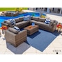 Each seating piece is handwoven in UV-resistant premium resin wicker with a rich brown finish, paired with a powder-coated aluminum frame that offers lightweight strength and rust-resistant performance in any climate.