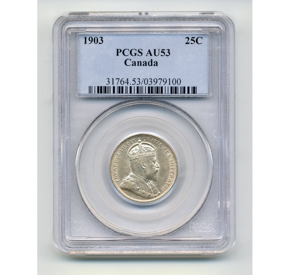 This high-grade 1903 Canadian 25-cent coin dates from the era of King Edward VII. It has been authenticated and graded as About Uncirculated AU-53 by the Professional Coin Grading Service (PCGS), and comes protected in a PCGS tamper-proof holder.