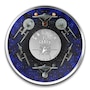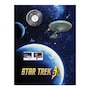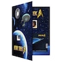 The coin design features six different views of the USS Enterprise in vibrant colour, including overhead, underside, bow, aft, starboard and portside. The different views allow the viewer to examine the starship from every angle. The dark background of this coin gives the viewer a sense of outer space, while the rich blue recreates a nebula cloud. The cover stamp design features a portrait of Captain James Tiberius Kirk in his gold uniform of Starfleet's command division. The background has the USS Enterprise in orbit over a red planet.