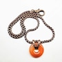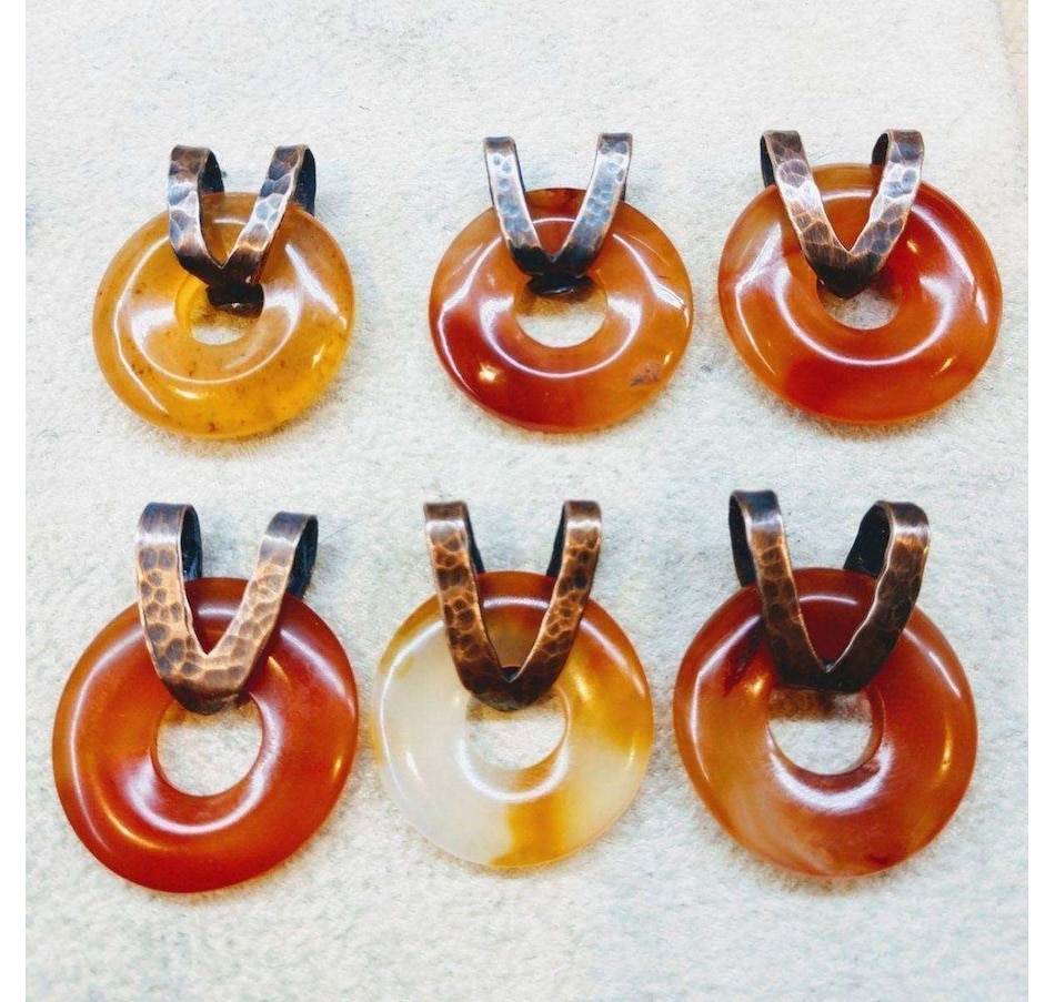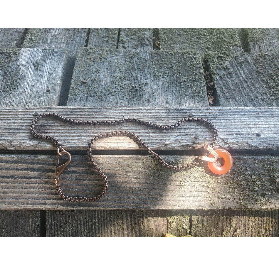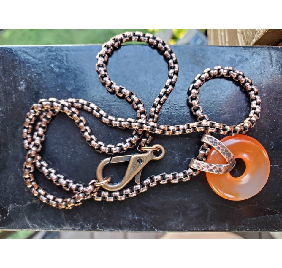 This one-of-a-kind Handcrafted hammered copper pendant holds a Smooth Carnelian Donut proudly in its secure grasp. The copper Venezianer box chain emphasizes the rustic style, with a large copper jump ring and lobster clasp. The copper is distressed for an added touch of rustic charm. Suitable for any modern man or woman seeking a bold and daring look!Original Design A rustic style unique design yet simpleHardened Hammer forged Copper BailAAA Carnelian gemstone Donut 25 mmThe color of gemstone varies as shown in the pictures5 mm handmade rounded Venezianer box chain Super large 1.25 in lobster closureLength of the necklace is 20 inchesMade in Montana The Gemstone Carnelian is the red, orange, or an amber variety of Chalcedony. Though often a solid color, it may also be banded, in which case it would be jointly classified as both Agate and Carnelian. Carnelian is an ancient gemstone, having been used as gem material for a long time. Each necklace will be a bit different.