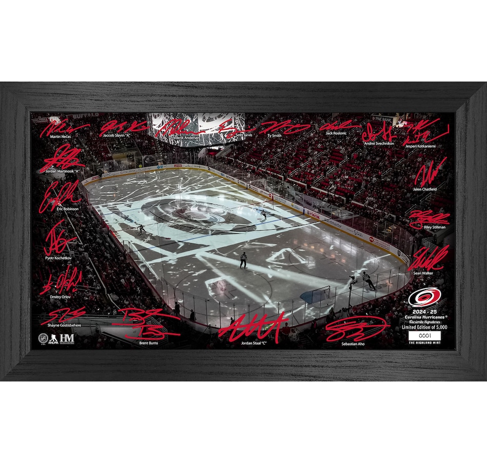 This 2024–25 Season Signature Rink features the facsimile signatures of the Carolina Hurricanes roster around their home rink. Each print is individually hand-numbered and delivered in a 12" x 20" wooden frame with an acrylic glass front panel.