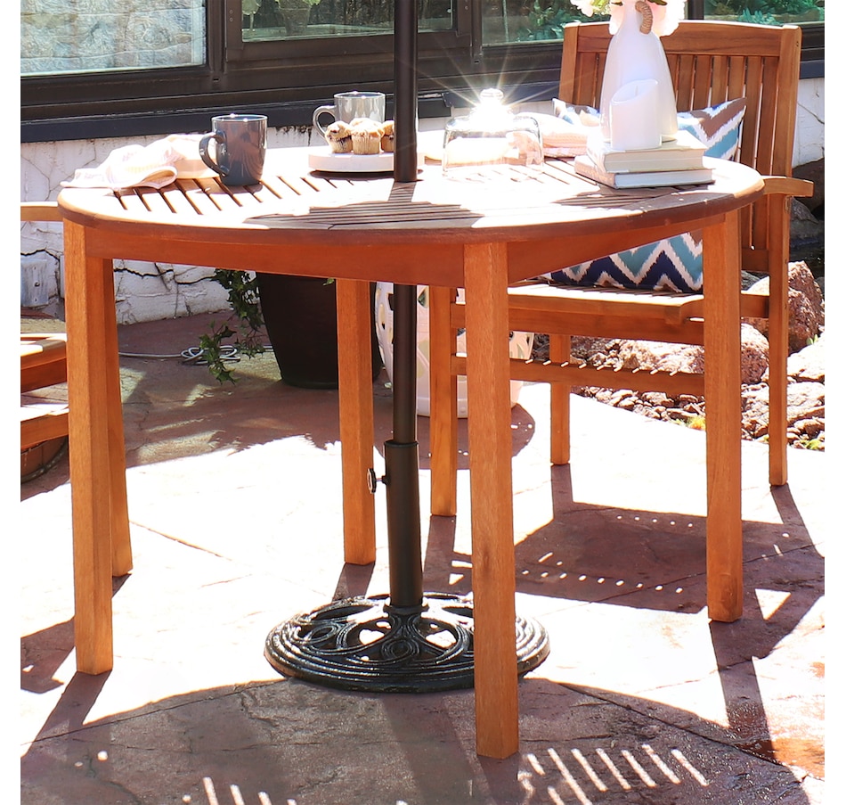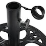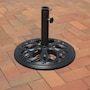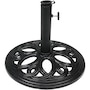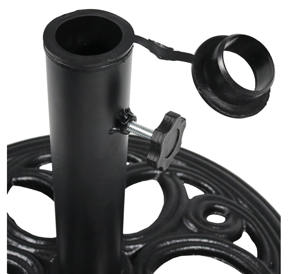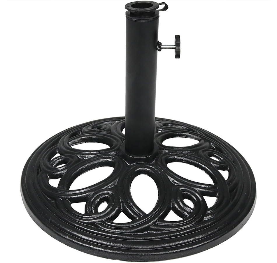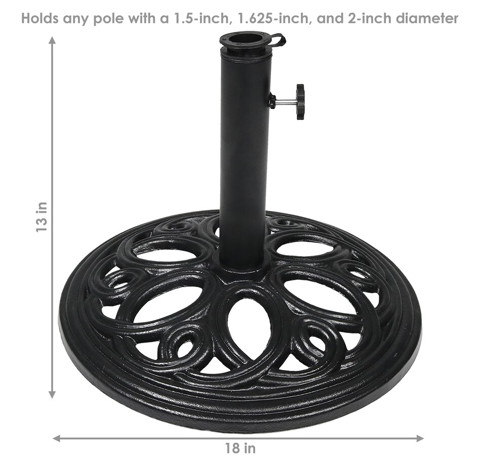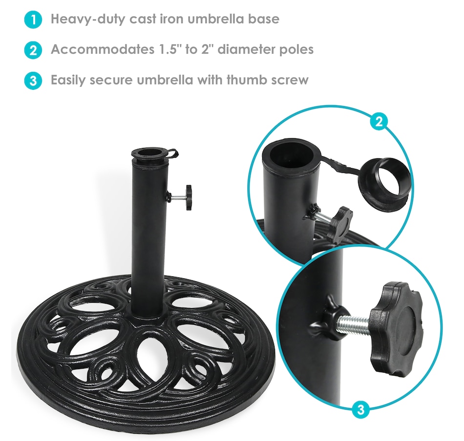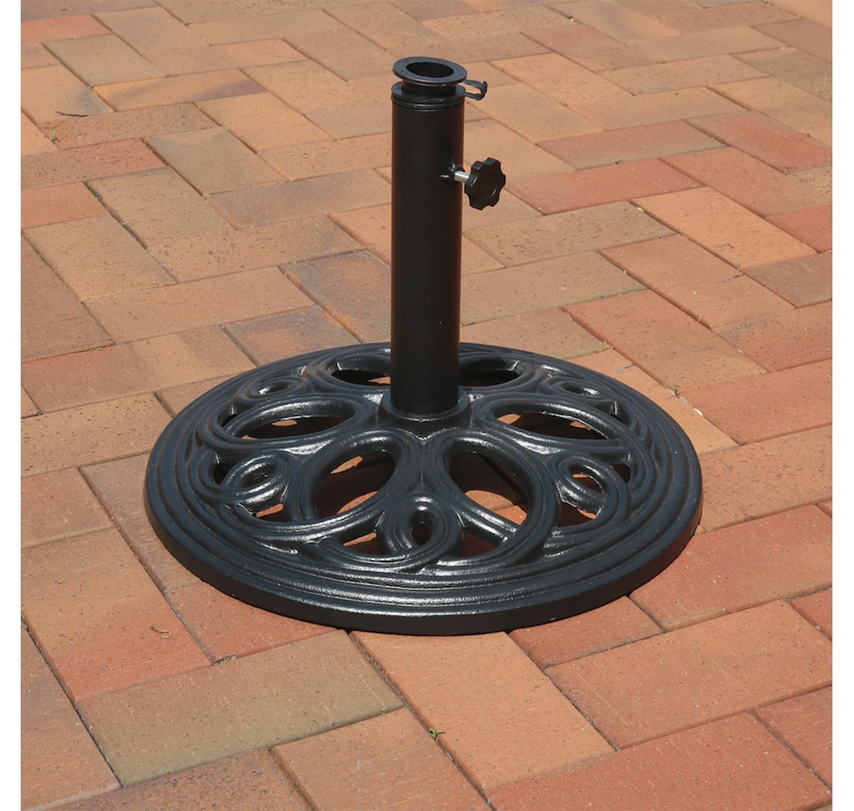 Bring home this functional yet stylish, heavy-duty outdoor umbrella base and keep a patio umbrella (not included) sturdy all summer long. Made from durable cast iron material, this weighted umbrella stand serves as a sturdy anchor for most outdoor patio umbrellas. When used beneath a patio table, the durable stem on the base for patio umbrellas helps to prevent an umbrella from tipping or being carried away by the wind. The included adapter allows a 1" diameter, 1.625" diameter or a 2" diameter umbrella pole to be inserted into the stem of the base. Simply turn the thumb screw until the umbrella is secured in the base. The decorative design on the cast iron umbrella base adds style and personality to any patio space. Keep friends and family safe from the sun with a beautiful umbrella (not included) on the patio, deck, or in the yard, and keep it in place with this heavy-duty umbrella stand.