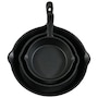 This 3-piece cast iron skillet set offers versatile, all-purpose performance in the kitchen or outdoors. Each pan comes pre-seasoned for immediate use and built to last through years of heavy-duty cooking. The set includes 6", 7", and 10" skillets—suitable for everything from searing meats and sautéing vegetables to baking desserts and preparing side dishes. Cast iron distributes and retains heat evenly, delivering consistent results whether used on the stove, in the oven, over a grill, or atop an open flame. Dual side spouts provide controlled pouring and help reduce mess. The naturally nonstick surface improves over time with regular use and proper care. Cooking with cast iron can also contribute to increased dietary iron intake. Skillets should be hand-washed with warm water and a stiff brush while still warm. Do not use soap or place the pans in the dishwasher. With proper maintenance, this set delivers long-lasting utility and robust performance for a wide range of recipes.