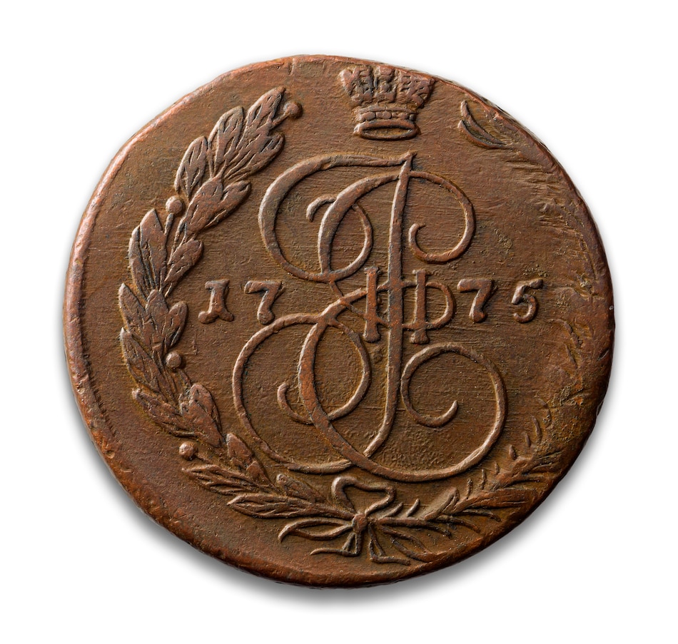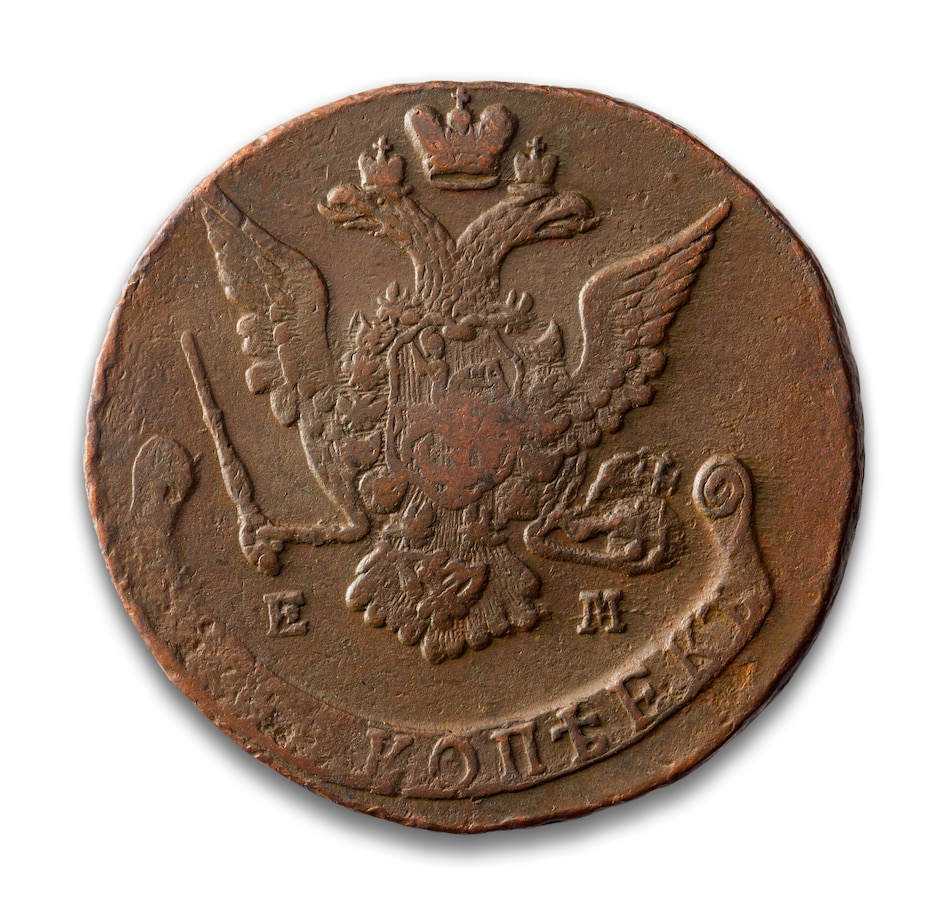 During the reign of Catherine the Great, the five-kopek coin served as an important denomination in everyday transactions. The main front design features the date encircled by a wreath with the monogram of Catherine the Great, while the back features a double-headed eagle. The two-headed eagle symbolizes Russia's geographical location in the middle of Europe and Asia; the two heads are needed to watch over the two continents to protect Russia's people.