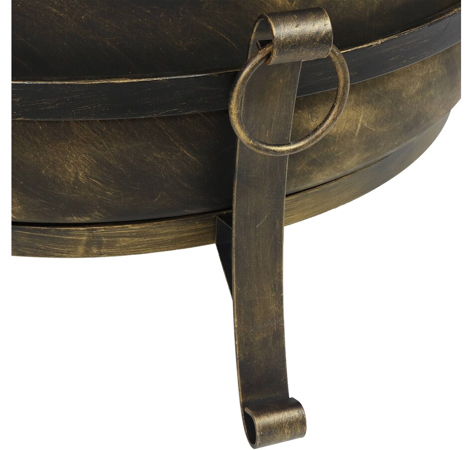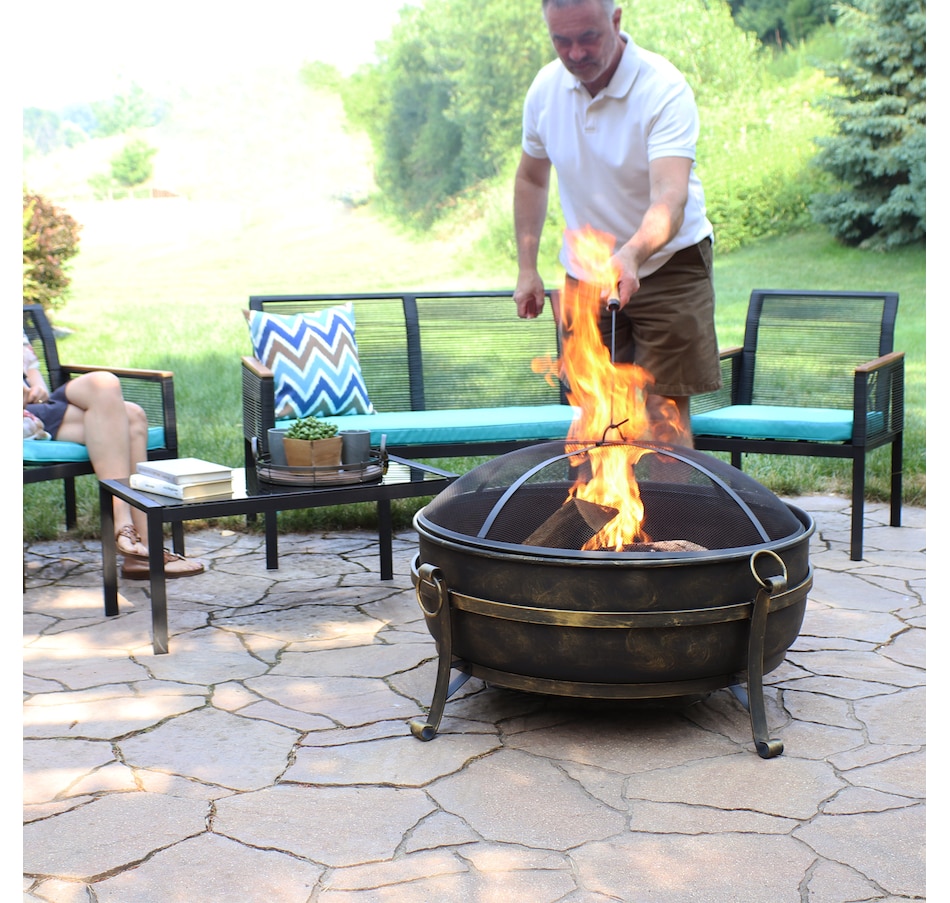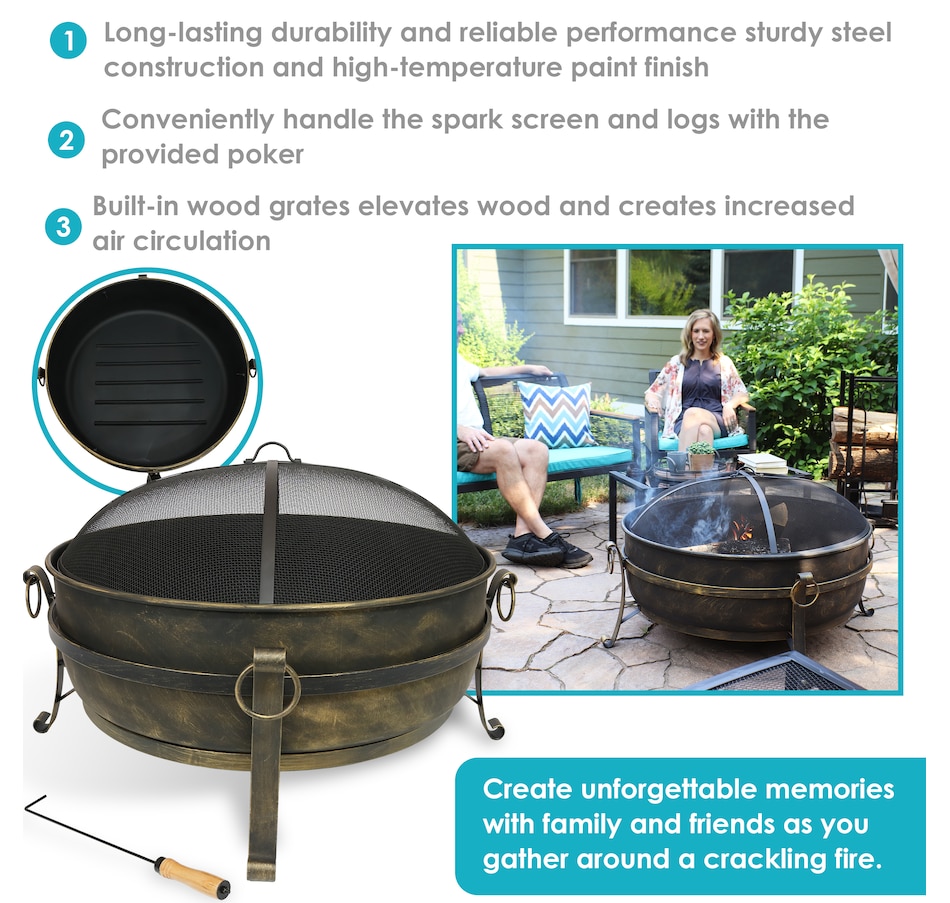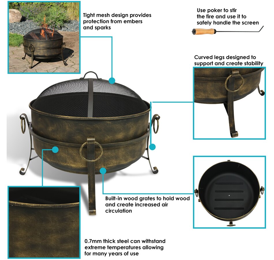 This steel, cauldron-style outdoor firepit with an included spark screen is sure to be a stunning centerpiece on any patio, yard, campsite, or other outdoor space. With its decorative legs, built-in wood grate, durable steel construction, and an attractive bronze finish, this fire bowl for outside is sure to be a hit among all your friends and family. The built-in wood grate allows for wood to sit comfortably while creating convenient air circulation all night long. Use the poker to easily maneuver wood and keep the fire burning all night long or use it to lift up the spark screen when it's hot. Create the fire pit space of the year! This firepit for outside features a beautiful dark bronze finish on the bowl and legs for further heat resistance and added style. The eye-catching design and details this fire pit has to offer is sure to complement any backyard decor.