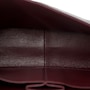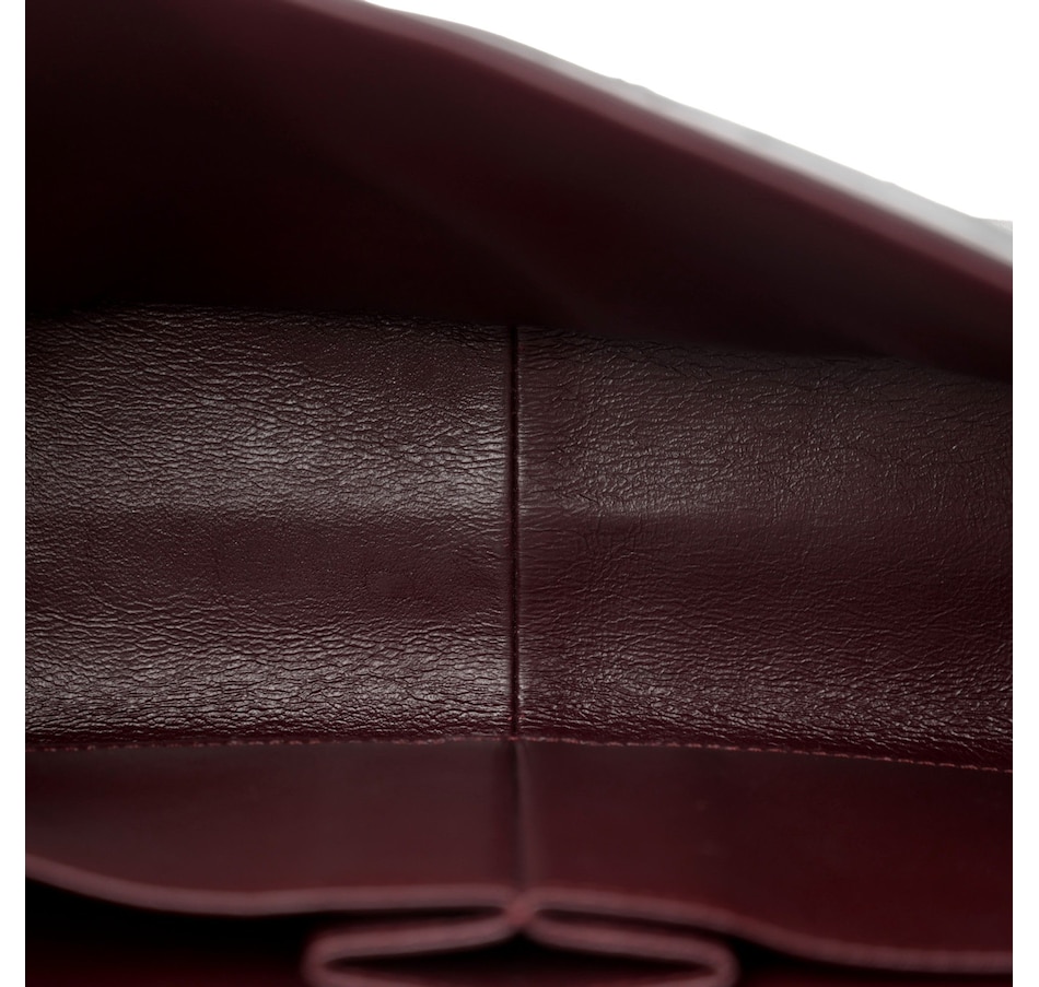 Opens to reveal an inner flap, a front pocket, and burgundy leather interior with patch pockets.