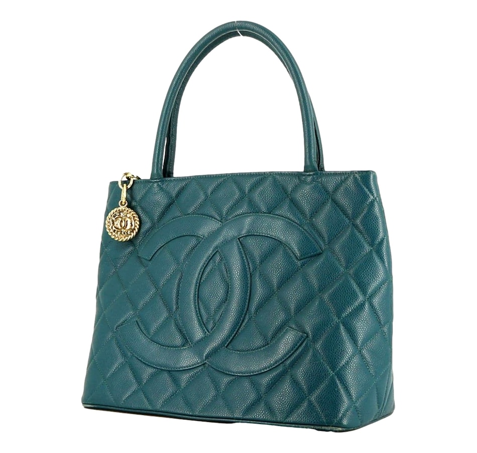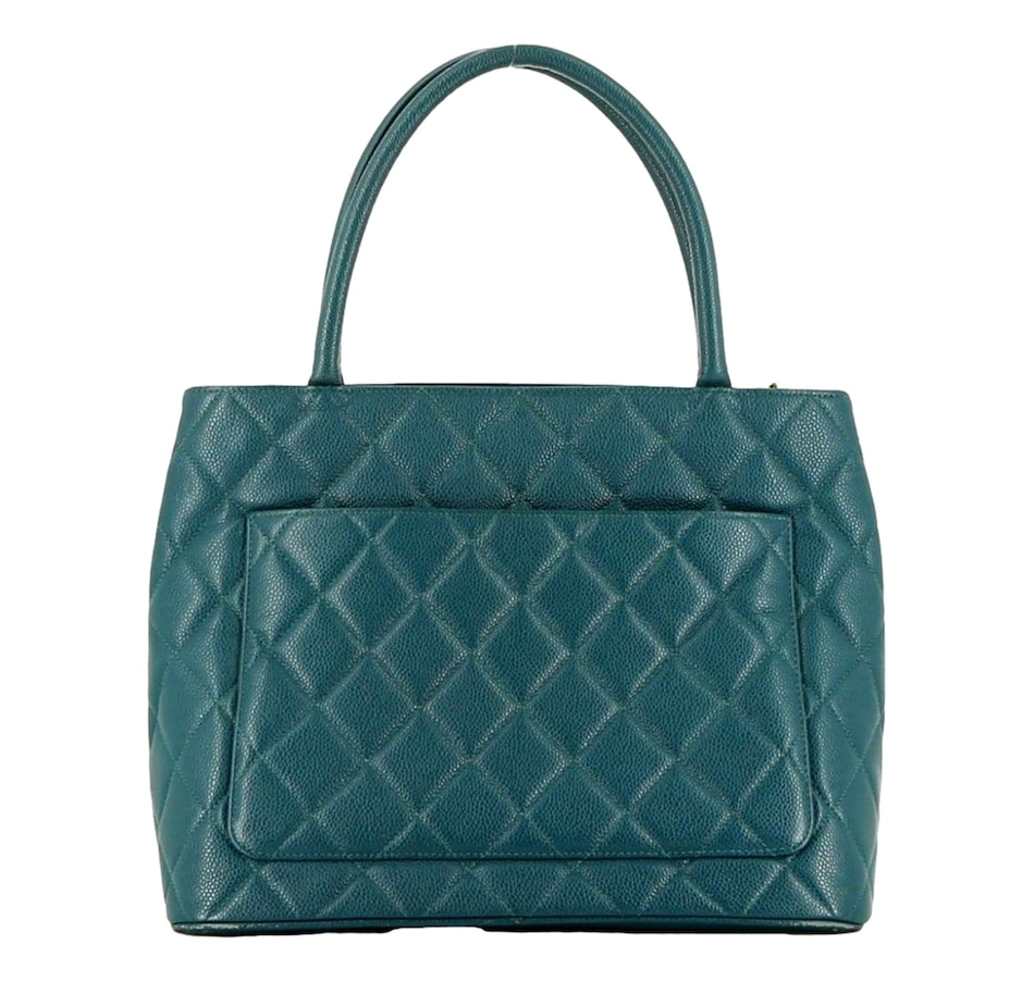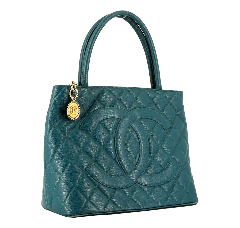 Teal is not a color Chanel reaches for often, which makes this Caviar Medallion Tote a genuinely special find. The deep blue-green tone plays beautifully against the tight, pebbled grain of caviar leather, one of the most sought-after materials in the Chanel universe for its scratch resistance and structural integrity. The quilted body and iconic CC hardware keep it unmistakably Chanel, while the color ensures it reads as anything but ordinary. This is a bag that makes a statement without trying.