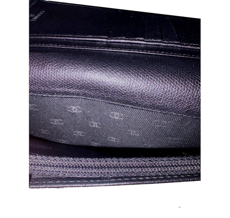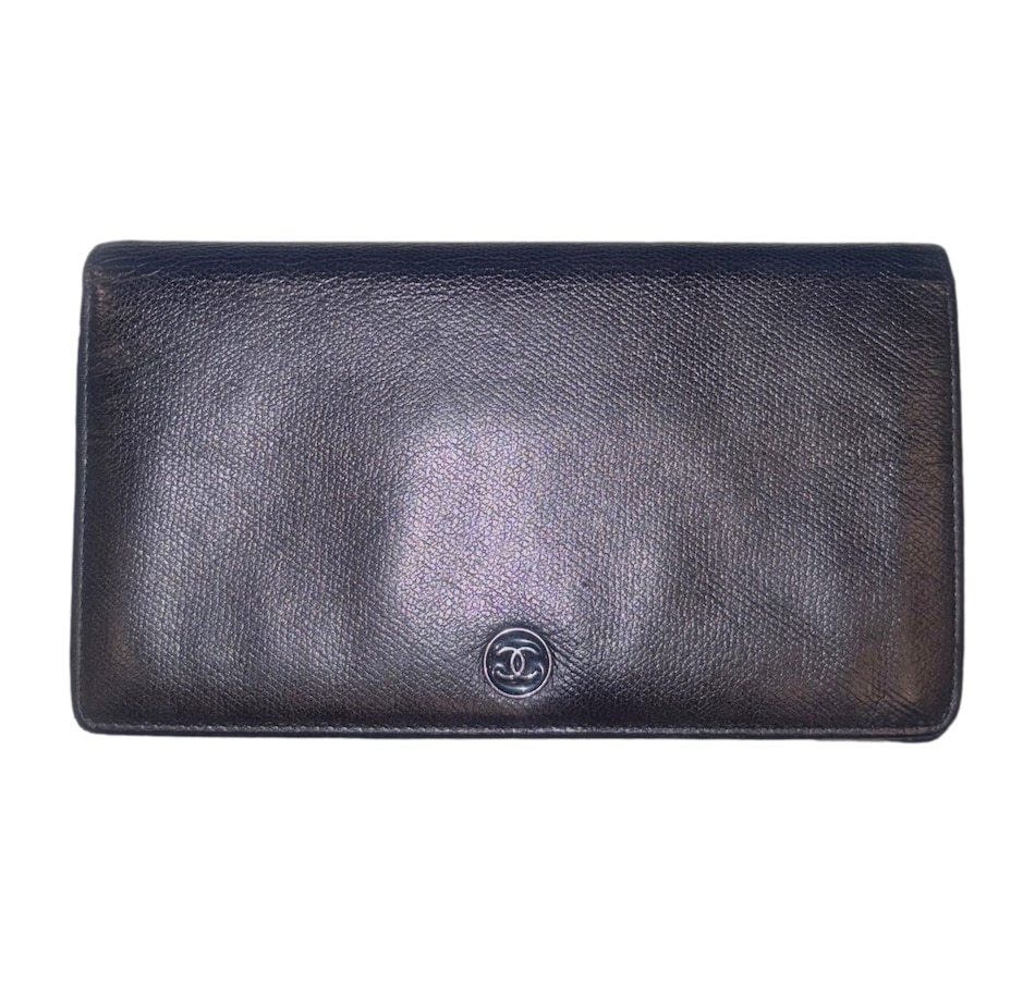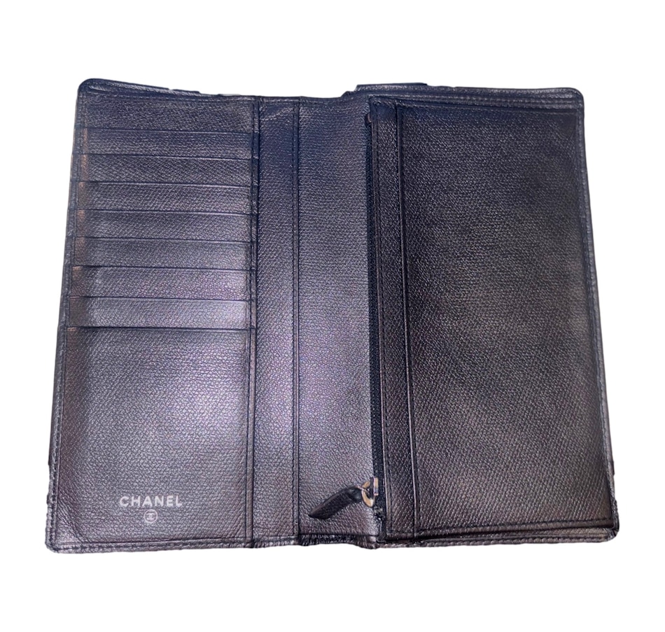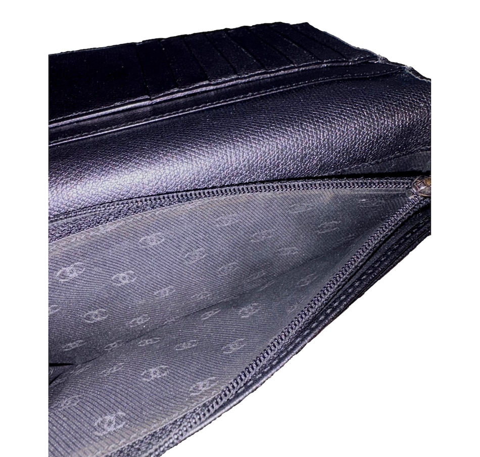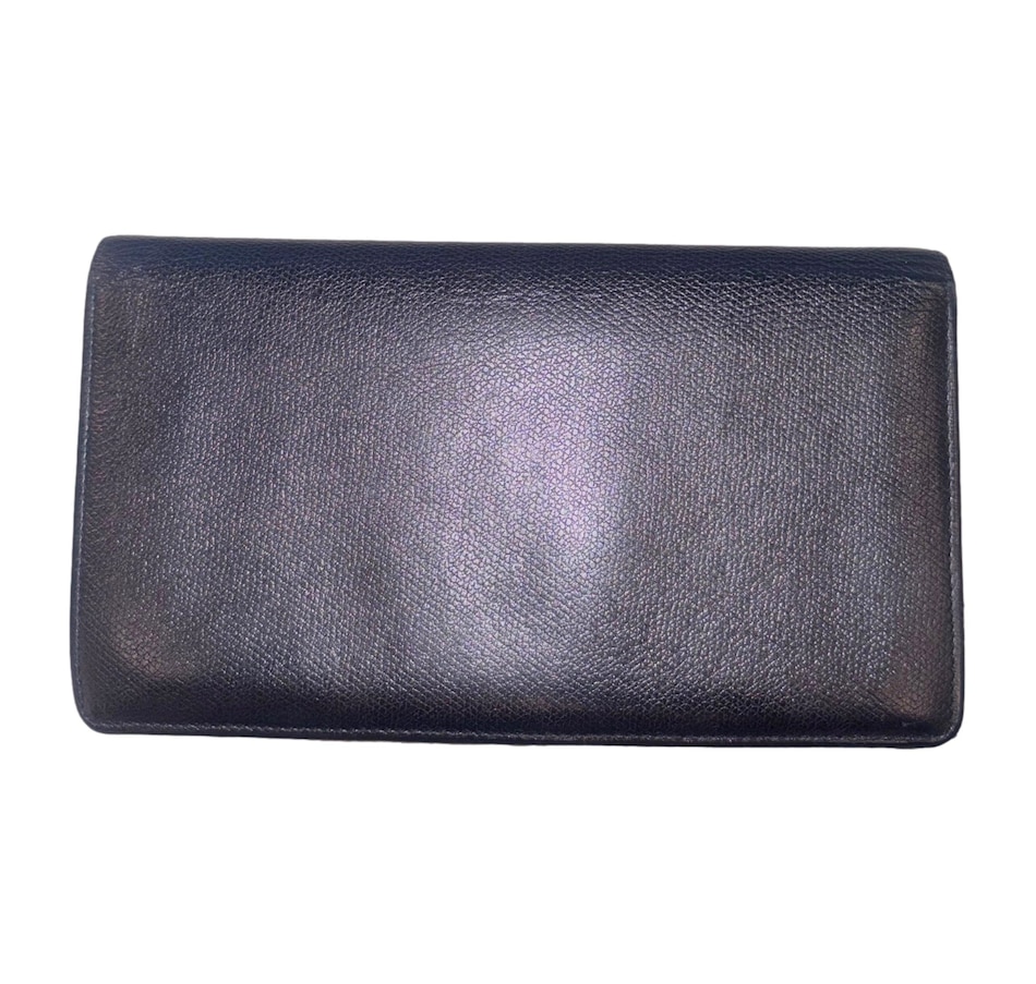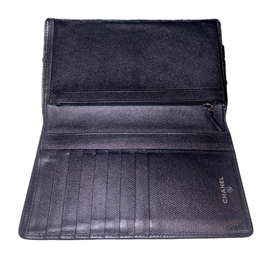 A masterpiece of timeless sophistication, this Chanel Vintage Yen wallet is crafted from the House’s iconic black caviar leather—renowned for its luxurious texture and exceptional durability. The elongated bifold silhouette opens to reveal thoughtfully designed compartments and a secure coin pouch, marrying practicality with Parisian refinement. Finished with the classic CC emblem, it’s an enduring statement of Chanel’s impeccable craftsmanship and effortless elegance. VINTAGE PREOWNED Condition: Good, apparent signs of wear such as corner wear and scuffing.  Black Caviar Leather CC Emblem 8 Card Slots 4 Slip Compartments  1 Spacious Bill Compartment 1 Zip Compartment Dimensions: 7.5" x 0.5" x 4" (LWH) Made in France Authenticity Number: 10859257 Includes Entrupy Certificate of Authenticity