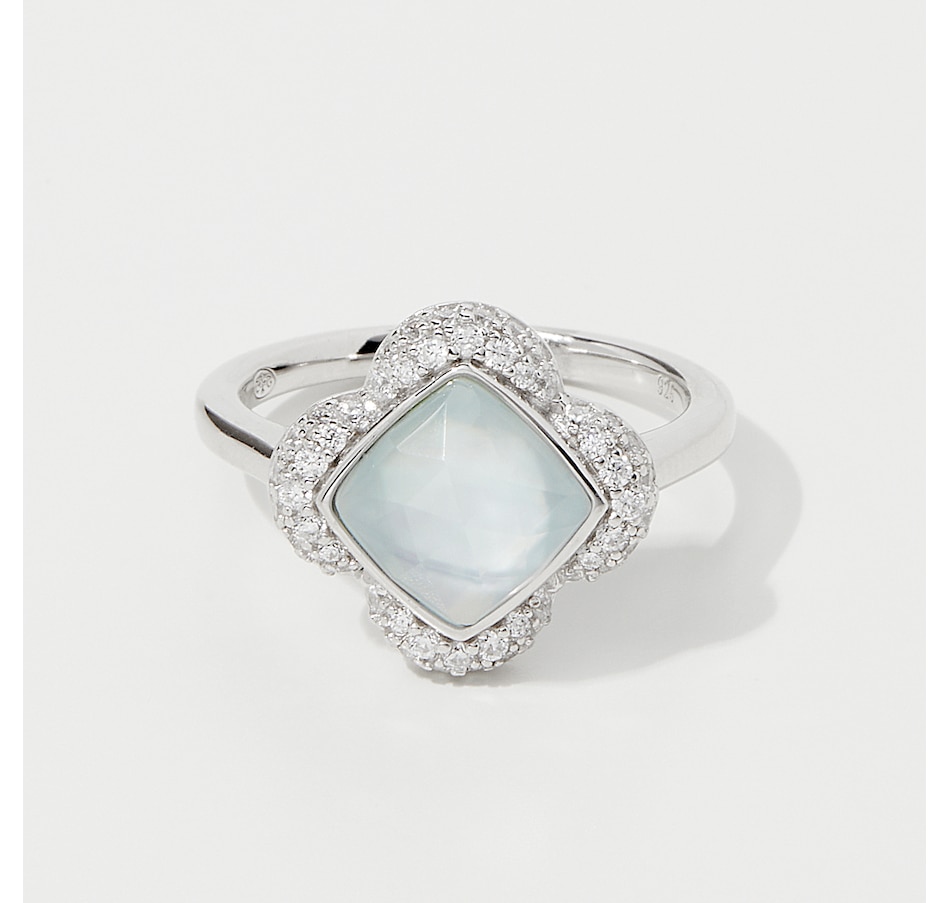 Sterling Silver Rhodium Plate "Bliss" Mother of Pearl, Synthetic Turquoise Crystal Doublet and Cubic Zirconia Ring