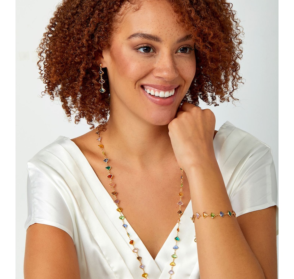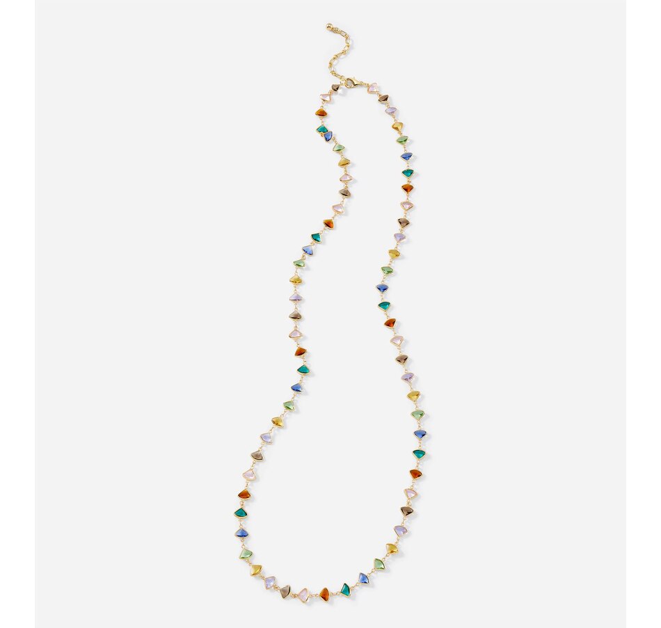A vibrant and ultra-chic jewellery piece that will add vivid hues and elegance to any look, this stunning coloured stones chain necklace will create a dazzling display on your neckline. With a secure clasp, this long statement piece features a delicate gold chain adorned with an array of diamond-shaped coloured glass stones.