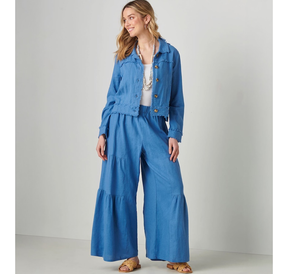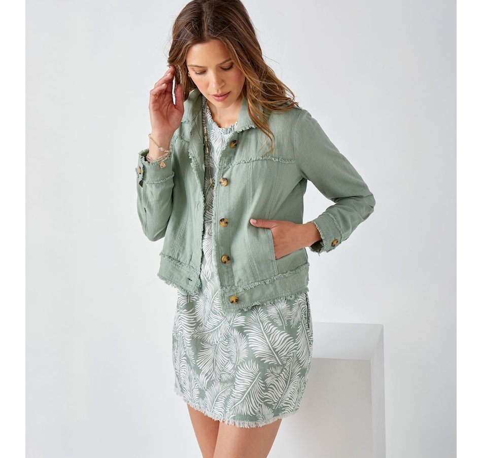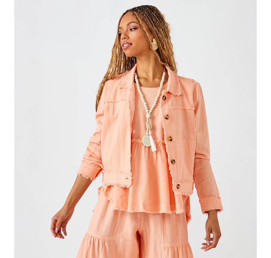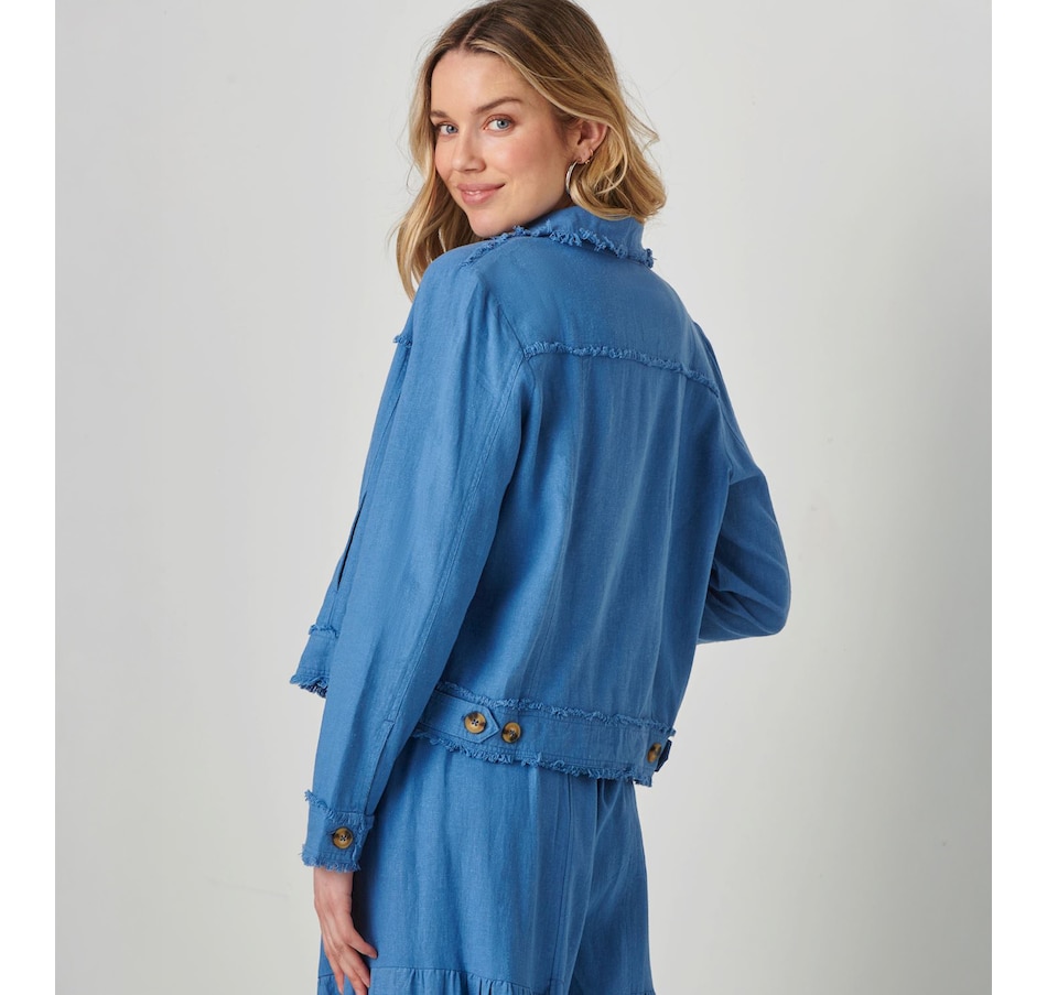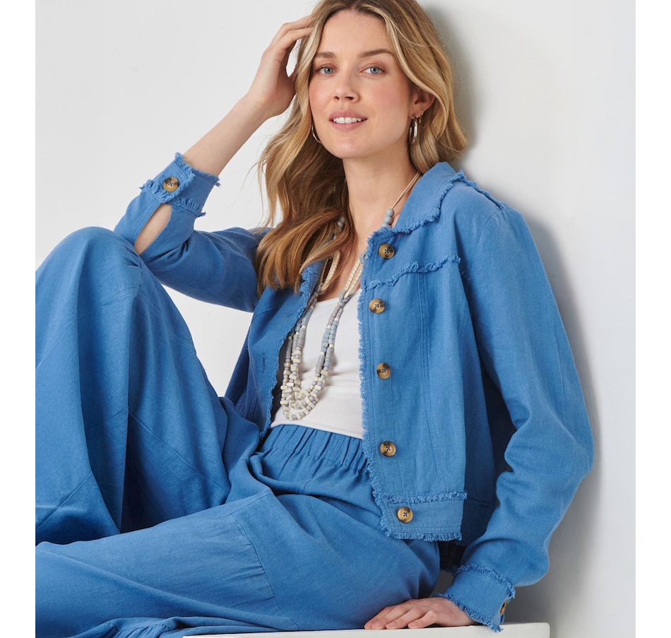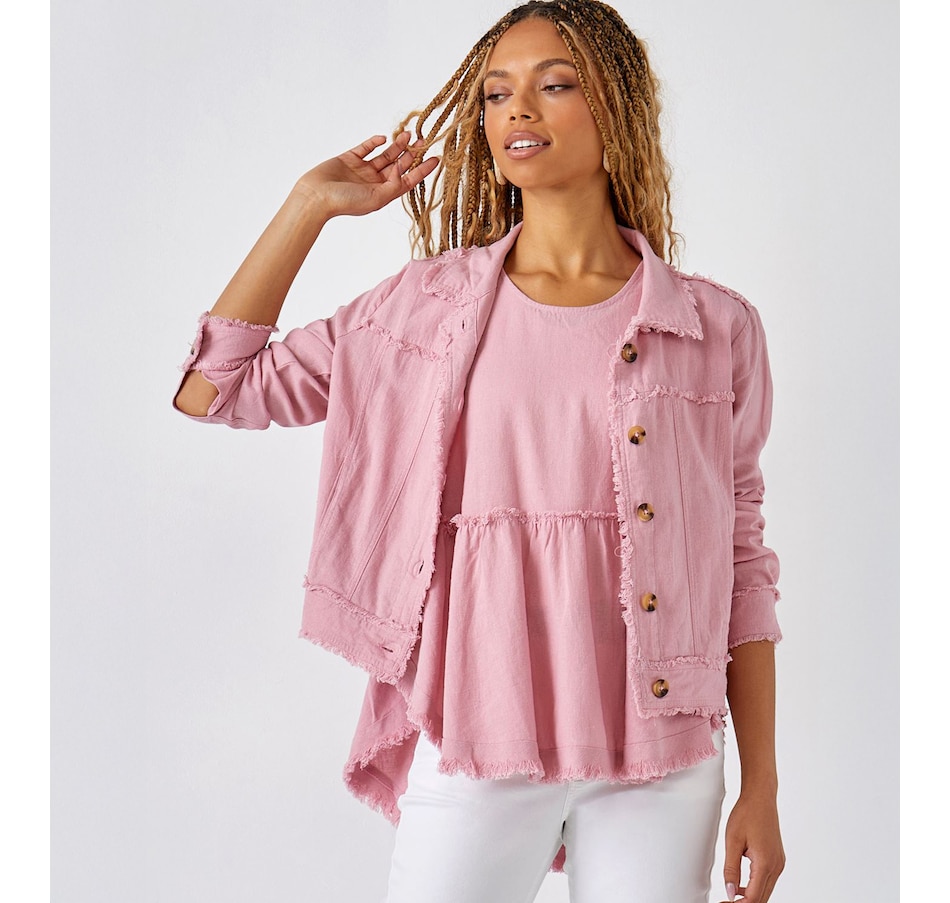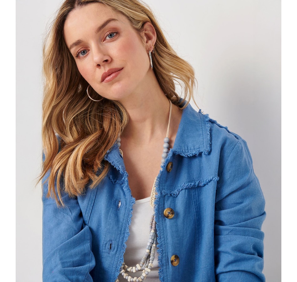 Available in a selection of beautiful summer colours, you'll centre every look in style with this linen blend jacket from Charlie Paige. A summer staple for an effortless casual chic look, it can be easily dressed up or down with its modern yet tailored jean jacket style silhouette. Made from a natural breathable linen viscose fabric, it features multiple pockets, raw edge seams, adjustable tab sides, and a loose and relaxed fit for ease of movement and warm weather styling