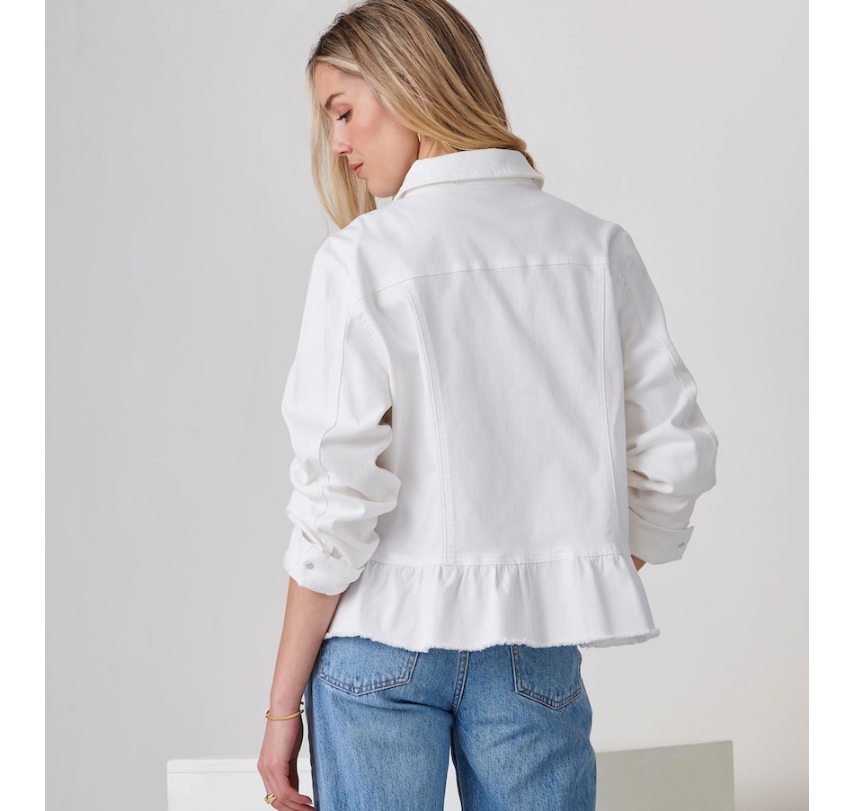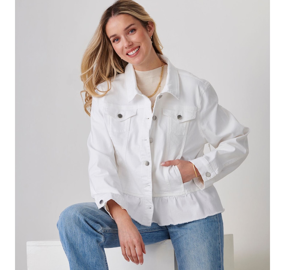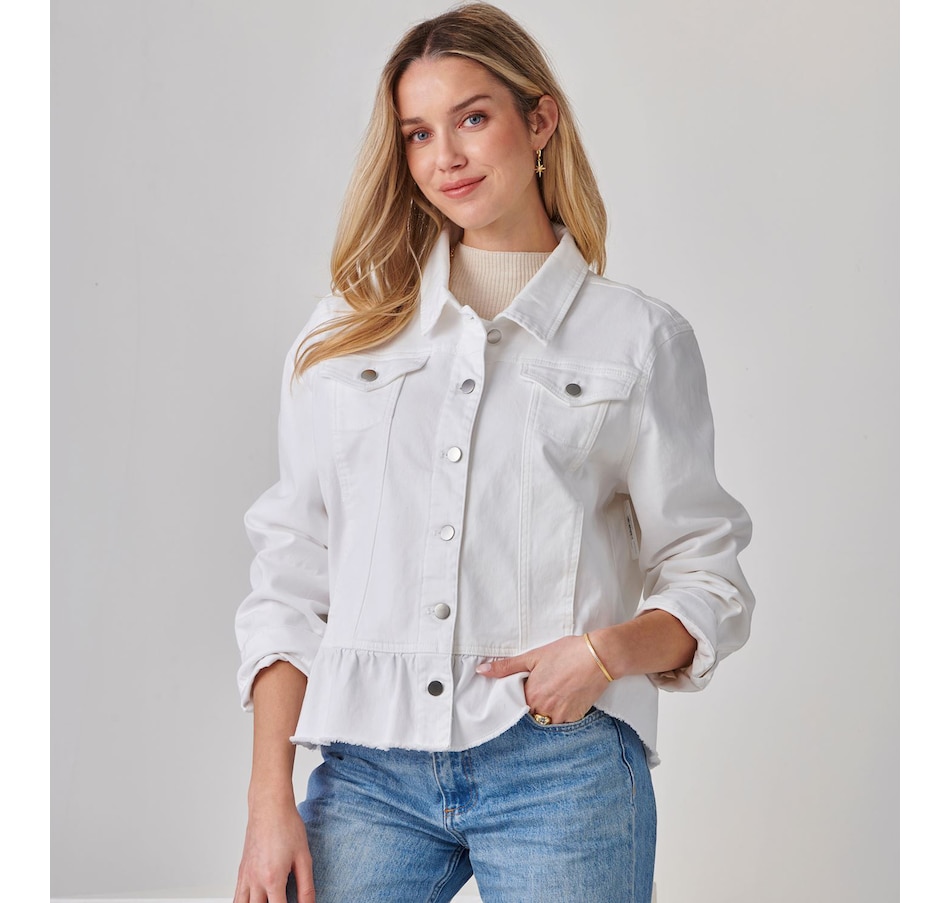 Charlie Paige brings to you this summery peplum jean jacket, featuring a button front, flap pockets and front seam pockets. It is designed in a fabulous body skimming fit in a breathable cotton spandex blend that moves with you to create a chic urban vibe.