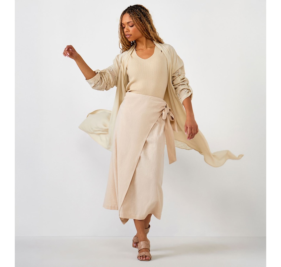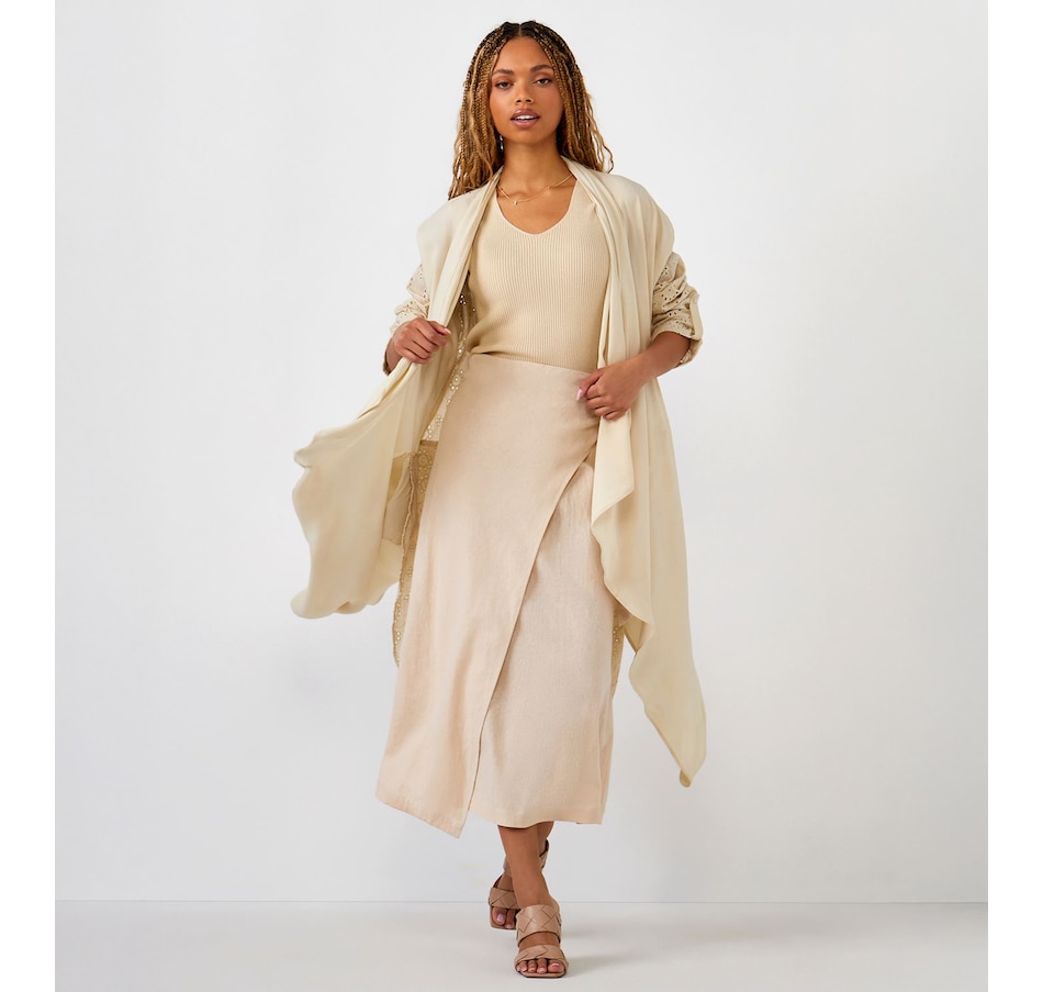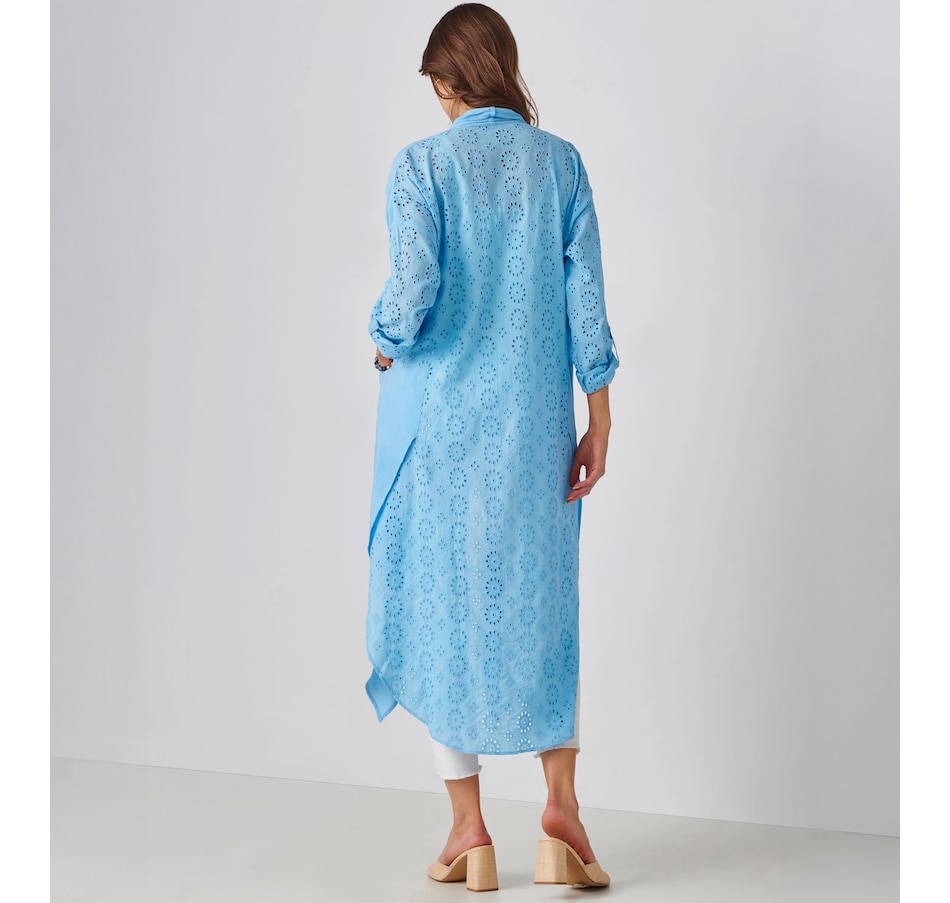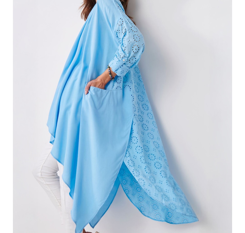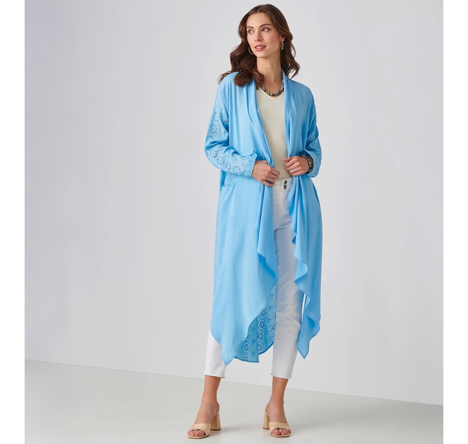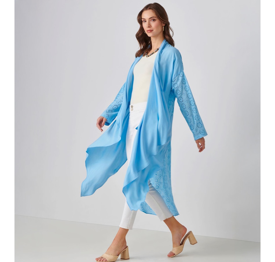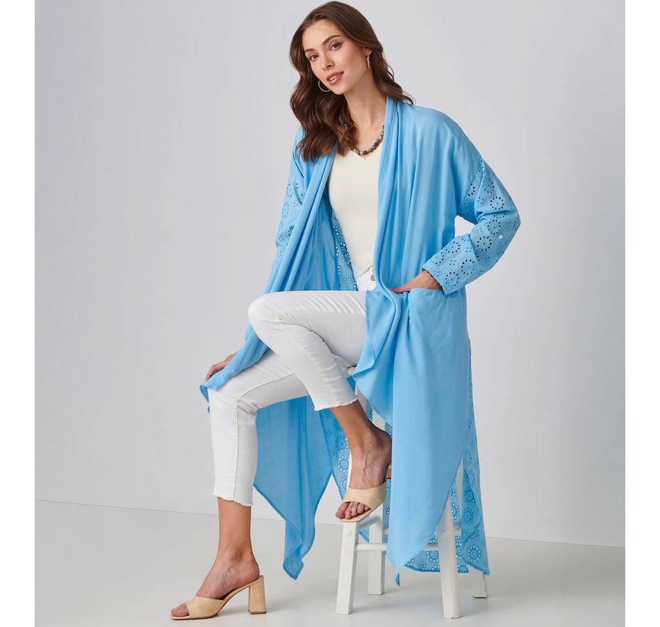 You'll seamlessly combine comfort and an elevated casual chic aesthetic with this cascading shawl kimono. Crafted from a flowy cotton and rayon blend, this midi length piece features long sleeves with sleeve tabs, a high low hemline, front pockets, and an eyelet back and sleeves.