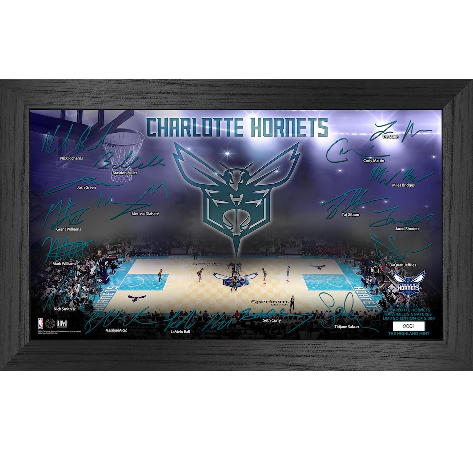 This Signature Court print features facsimile signatures of the Charlotte Hornets roster displayed around their home court. Each print is hand-numbered and comes in a 12" x 20" wooden frame with an acrylic glass front panel.