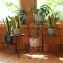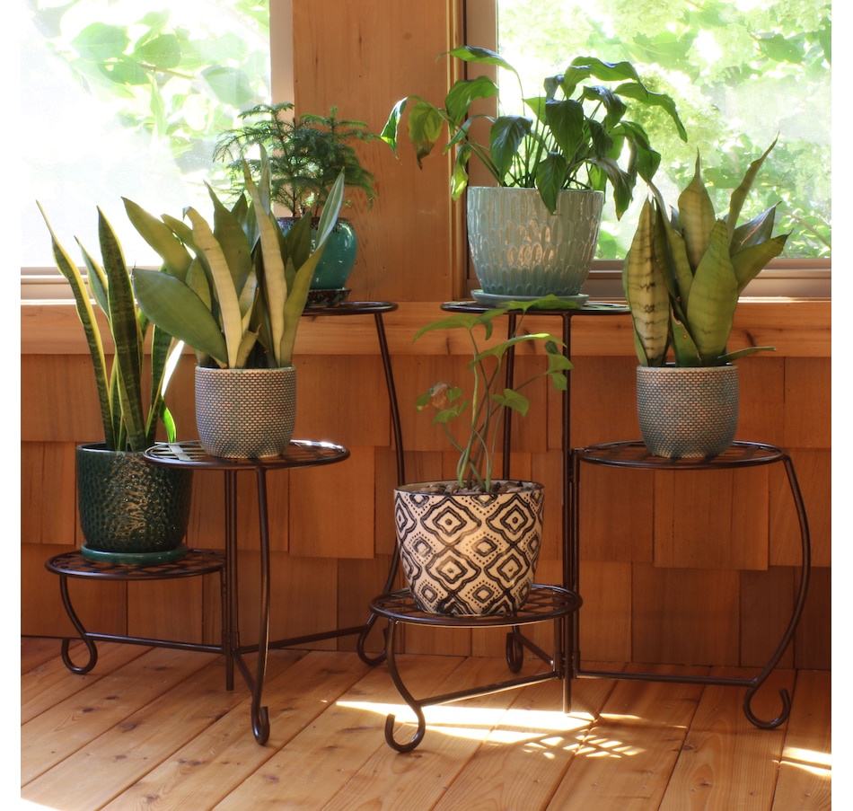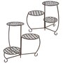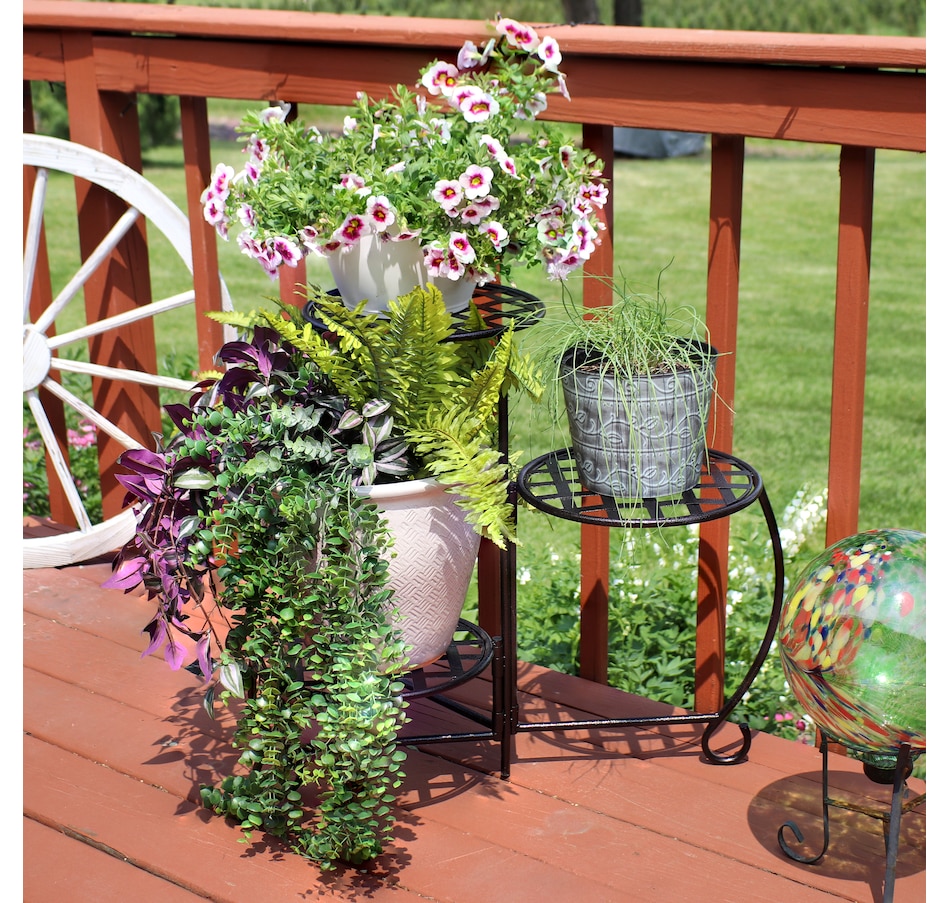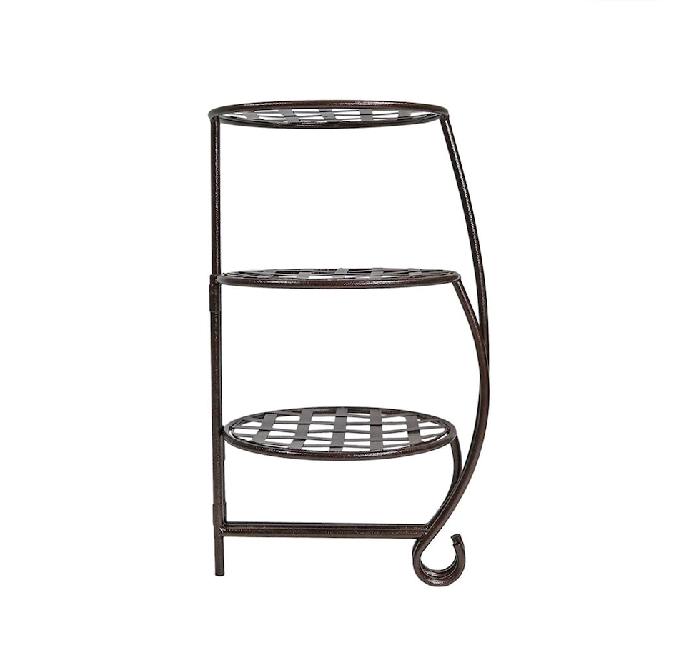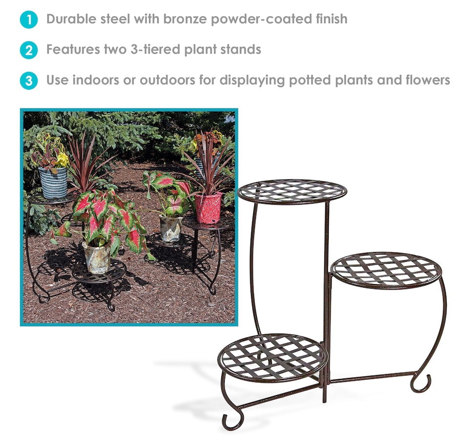This 2-piece plant stand set brings structure and charm to both indoor and outdoor spaces. Each stand features three tiers with a checkered surface and elegantly scrolled legs, offering a classic look suited for patios, decks, gardens, entryways, or living rooms. The staggered tier design allows for a dynamic floral arrangement, and each tier provides sturdy support for various planter styles and sizes. Constructed from powder-coated steel with a bronze finish, these stands are built for long-term durability and weather resistance. The folding design reduces storage space when not in use by sliding the single-tier leg over the two-tier leg. Whether placed together for a cohesive display or spread throughout a space for visual interest, this set offers flexible placement options for real or artificial plants. Both functional and decorative, this plant stand set makes a thoughtful addition to seasonal decor or special events.