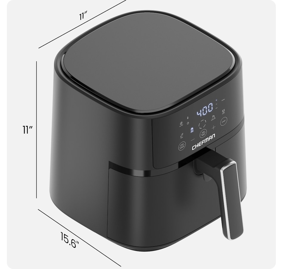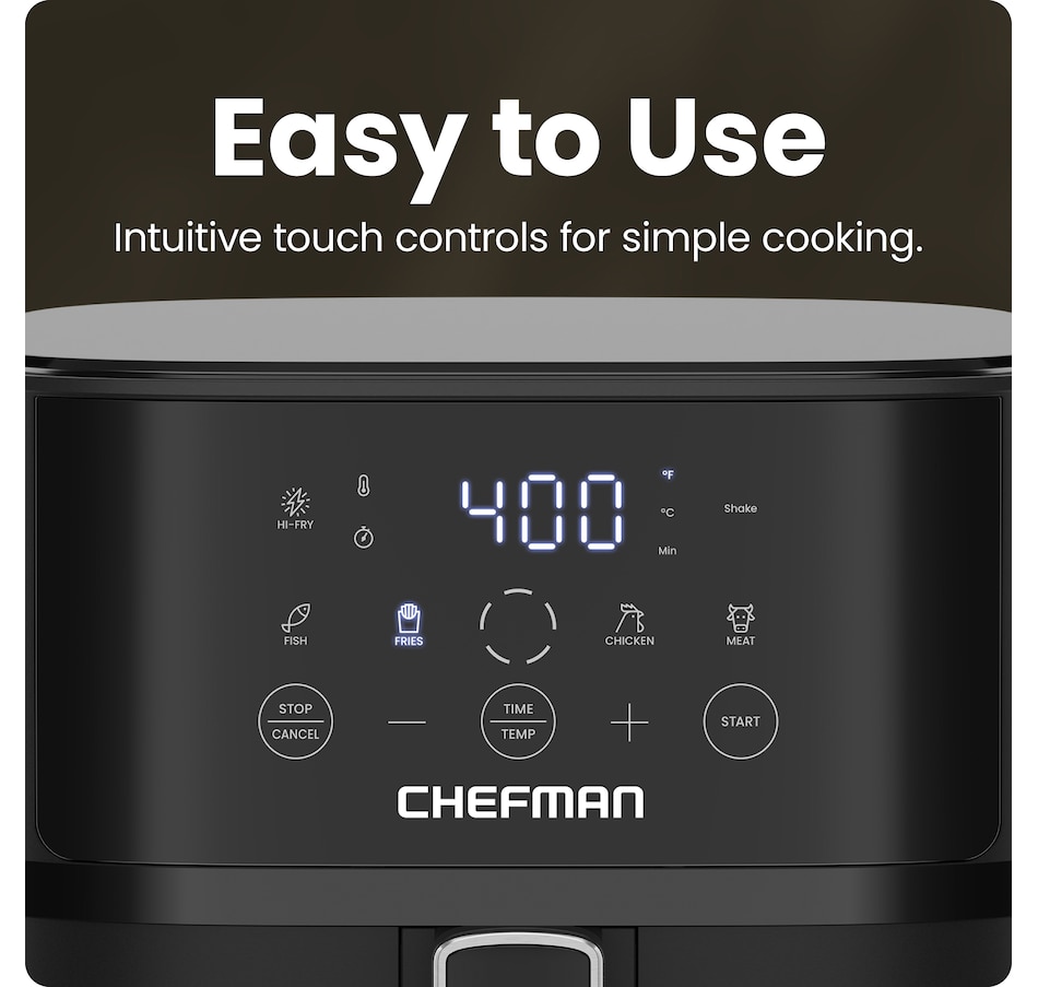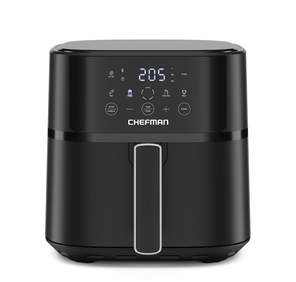 Healthy, fast cooking is within reach with the Chefman TurboFry Touch easy-view 6-quart digital air fryer. You'll air fry quickly using little to no oil and cook up to three times faster (on average) than an oven. Revitalize any limp leftovers, create perfectly crisp French fries, and cook crunchy chicken tenders with a fraction of the calories. The touchscreen user interface lets you easily select cooking time and temperature or choose from one of four popular cooking presets for an easier way to make dinner. The 6-quart capacity is ideal for cooking meals for a family. Use the Hi-Fry button during the last two minutes of cooking to increase the heat to 450°F, which is great for an extra-crispy final product! The nonstick basket and rack are both top-rack dishwasher safe to make cleanup easy. For added safety, the TurboFry air fryer shuts off automatically when the basket is removed, or the timer runs out.