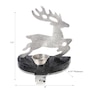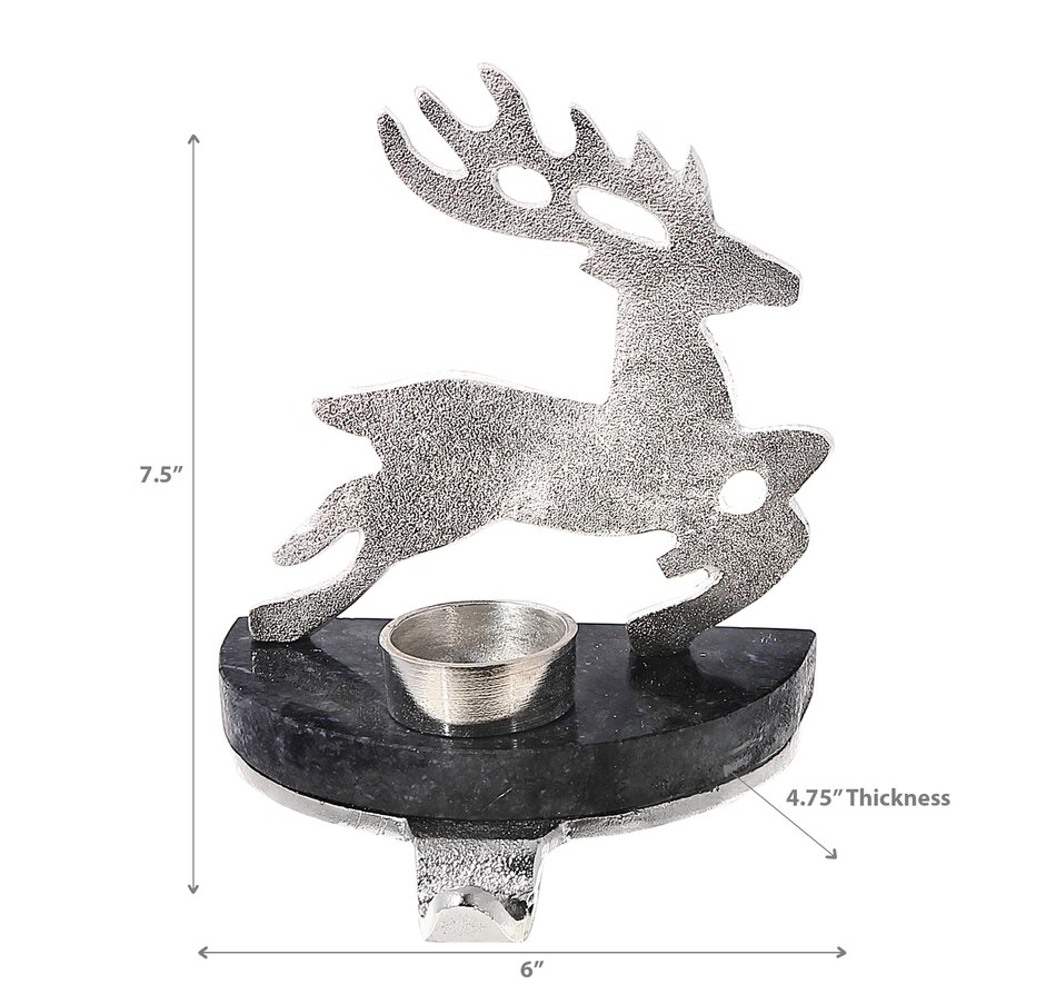 This elegant and whimsical Metal and Granite Reindeer Tealight Stocking Holder is perfect for adding a touch of festive charm to your home decor this holiday season. This unique stocking holder features a stunning combination of high-quality metal and granite construction. The intricate and delicate silver reindeer design creates a beautiful and playful atmosphere, while the marble base adds a touch of sophistication and elegance. The tealight holder atop the reindeer adds a warm and inviting glow.