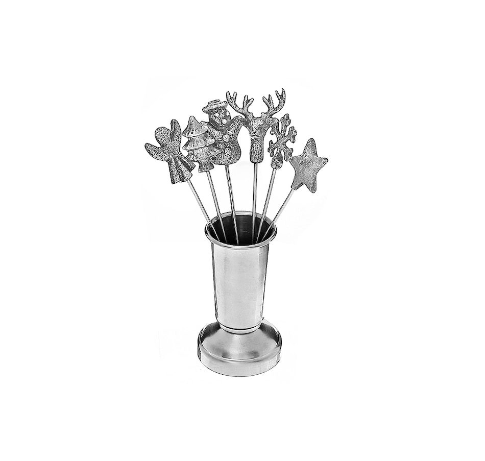 Add some holiday cheer to your next party with this set of six assorted cocktail picks featuring a charming snowman, reindeer, star, snowflake, Christmas tree, and gnome designs. Each pick is carefully crafted with attention to detail, creating a festive and fun addition to your cocktail hour. Made from high-quality aluminum, these holiday picks are made to last. These picks also come with a slender and stylish holder to prevent them from getting lost.
