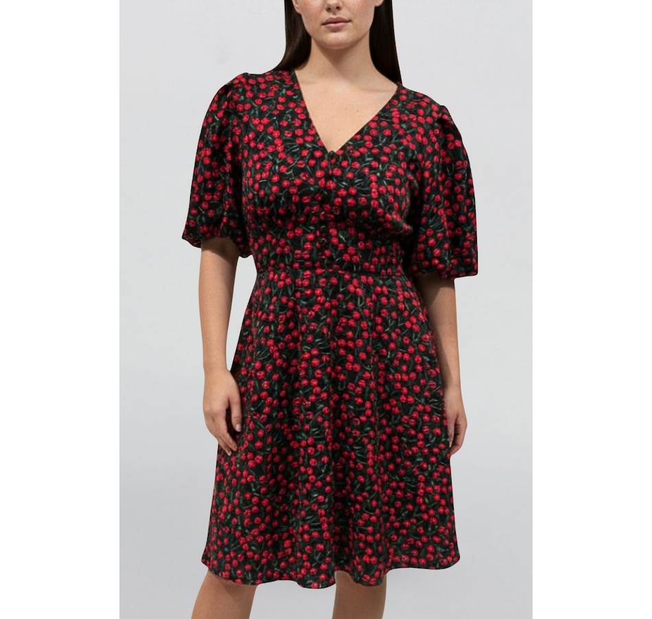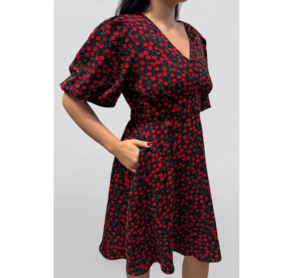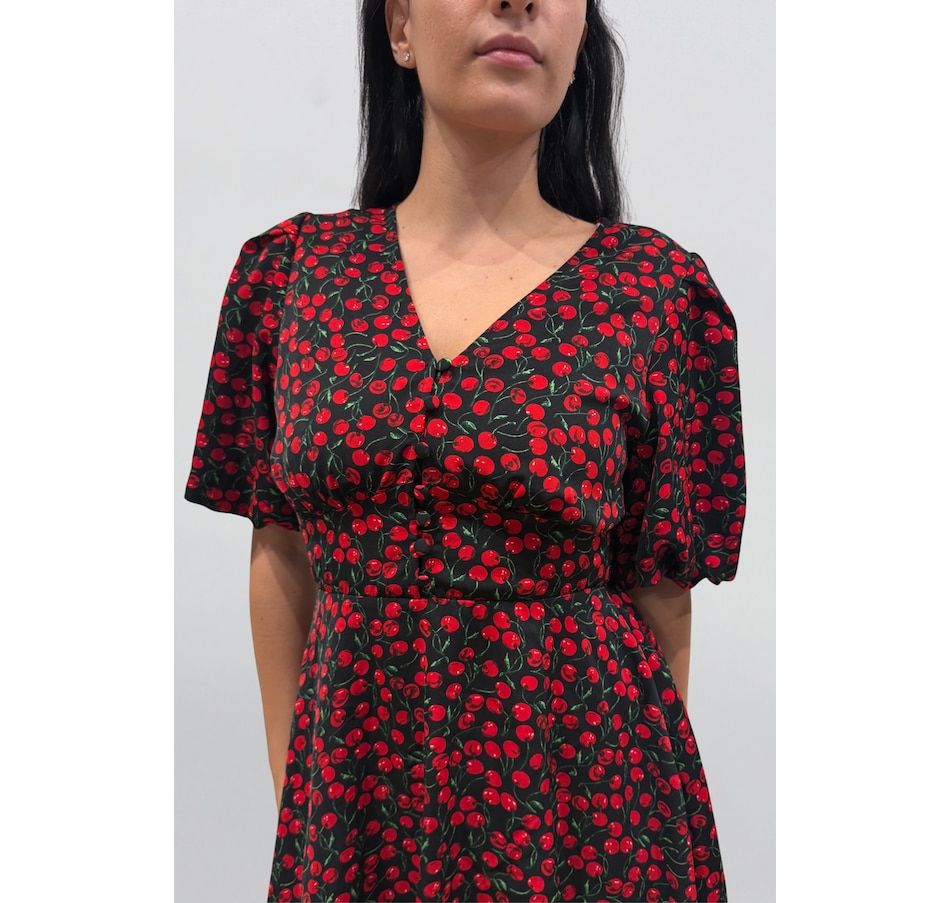 The black backdrop makes the vibrant red cherry print pop, creating a look that’s as fun as it is feminine. Ideal for casual outings, brunches, or spontaneous summer plans.
