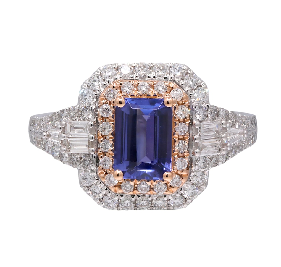 • (1) 5mm x 7mm emerald cut, prong set and faceted tanzanite (1.45 av. ctw)