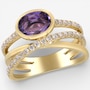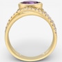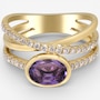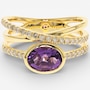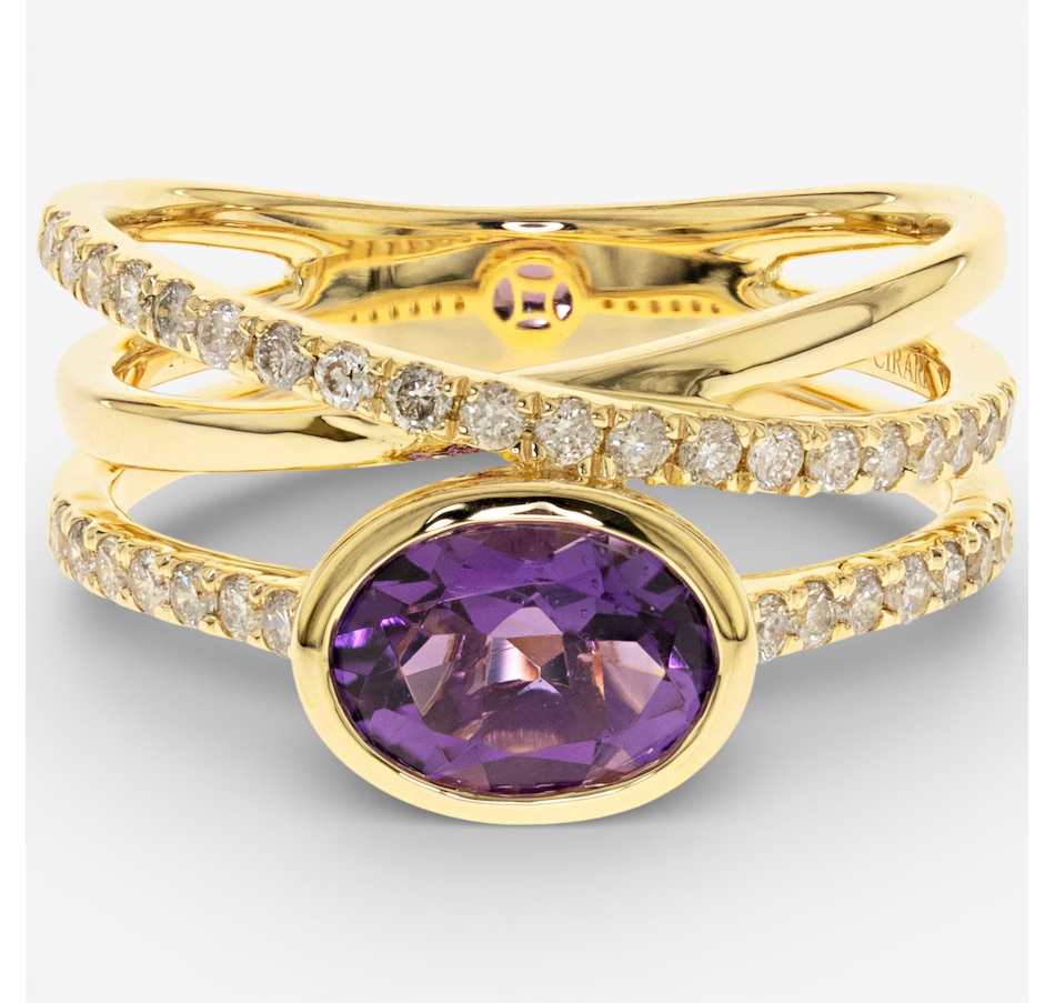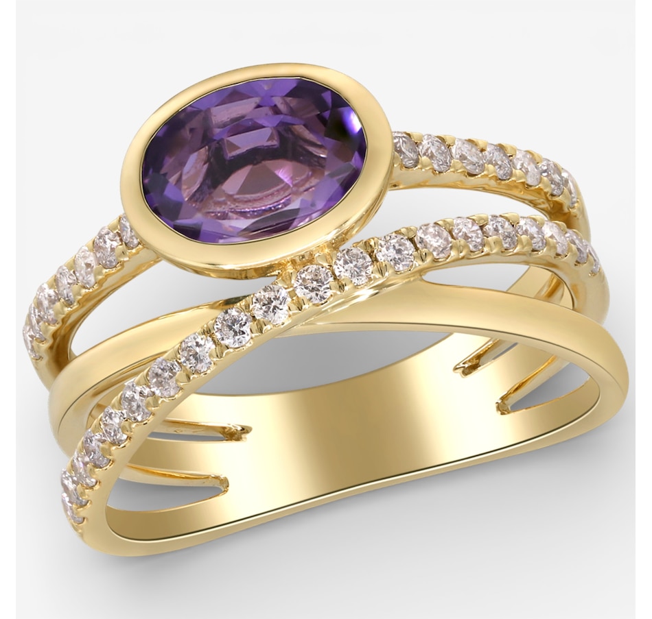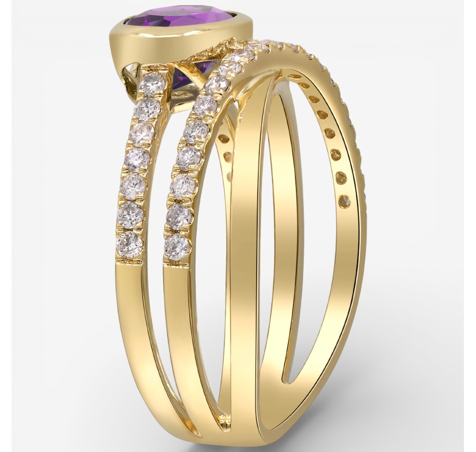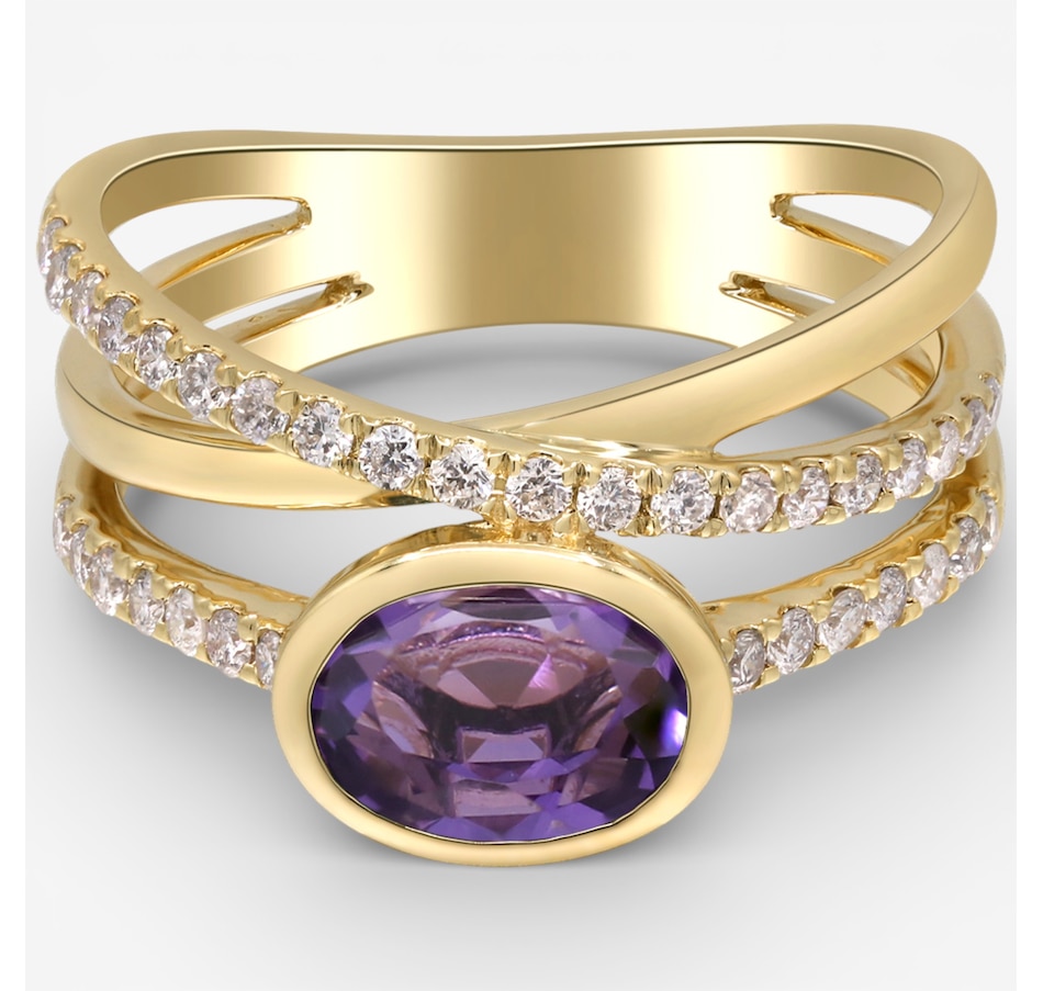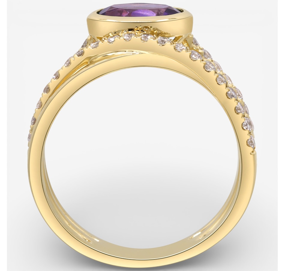 Indulge in timeless elegance with this breathtaking 14K yellow gold amethyst and diamond Ring, a refined design that blends vibrant colour with luxurious sparkle. At the centre, a richly faceted oval amethyst radiates in royal purple hues, beautifully bezel set to highlight its depth and brilliance. Framing the centerpiece, thirty‑four prong‑set white diamonds cascade along the sculptural split shank, catching the light with every movement for a look that’s both graceful and eye‑catching. Crafted in warm 14K yellow gold, the ring features a detailed side gallery and smooth under gallery that make for exceptional comfort and a flawless fit.