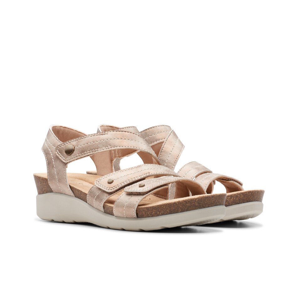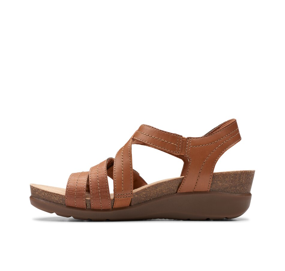 Part of the brand-new Calenne collection, the Calenne Clara wedge from Clarks combines unrivalled comfort, a stylish cork flecked midsole and extreme flexibility, creating an elevated travel sandal. Perfect for dressing up or down with its sleek leather uppers and strappy profile, the Ultimate Comfort footbed and adjustable fastenings make every step one you can count on.