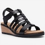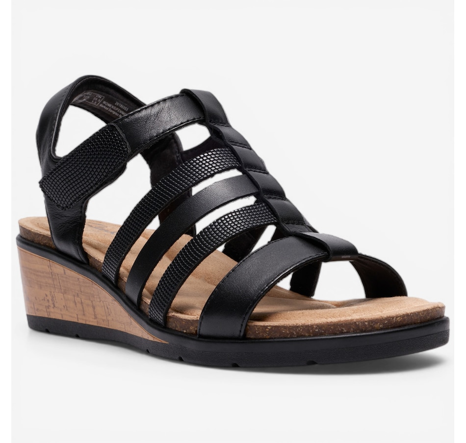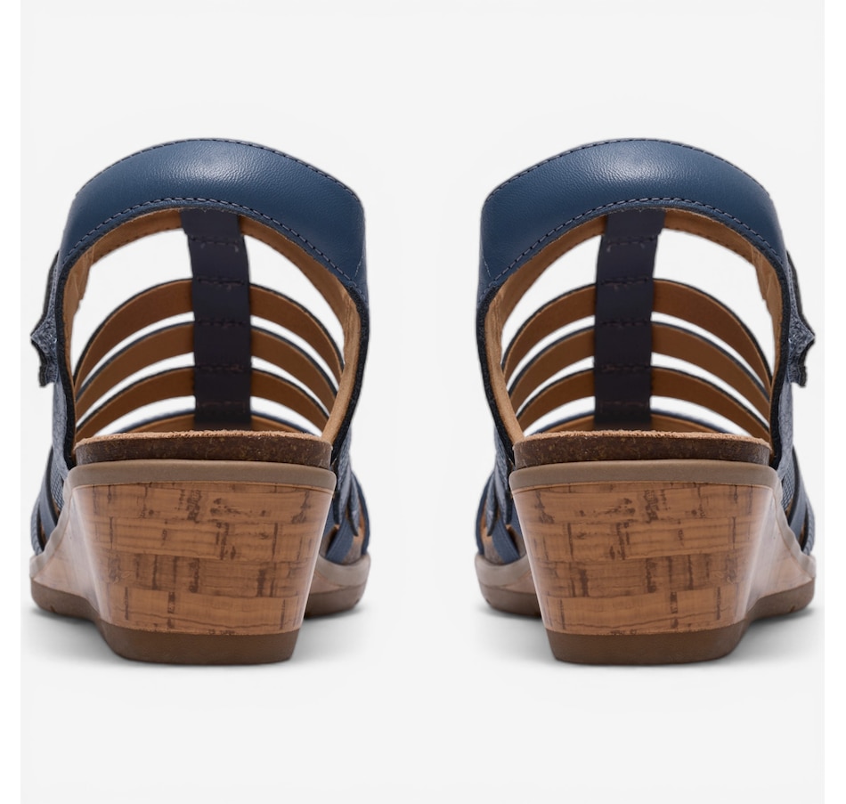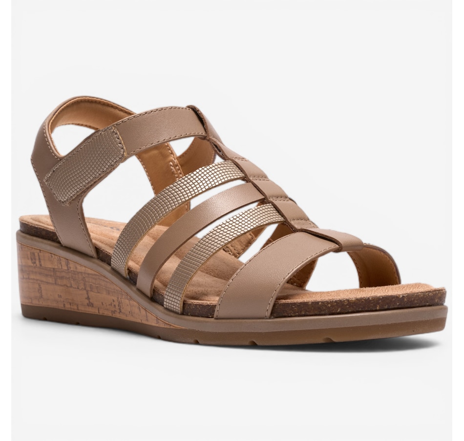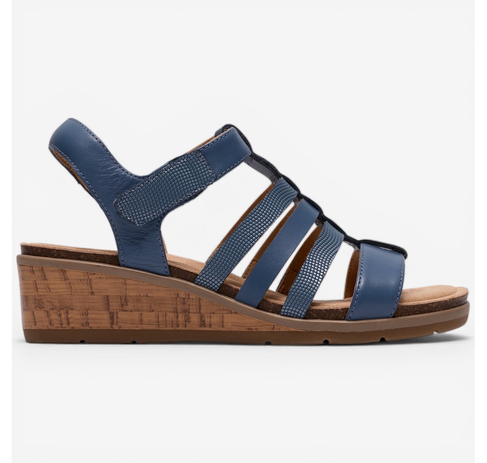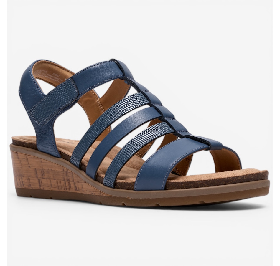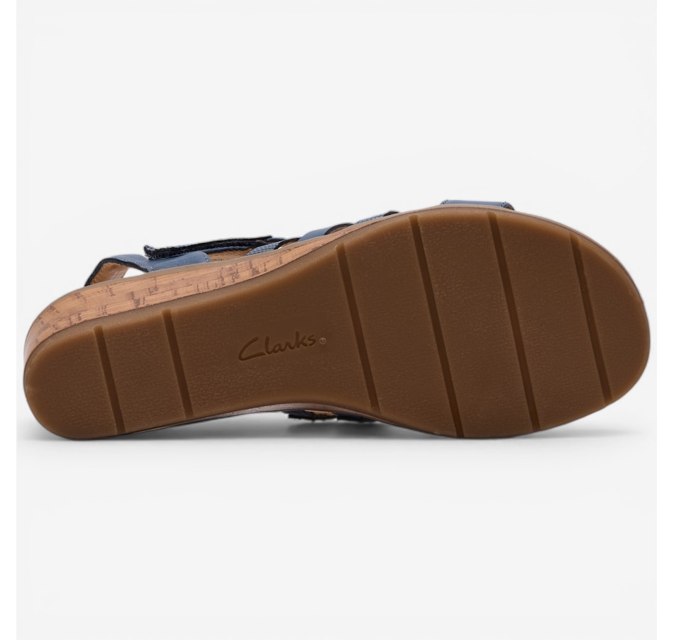 Step into easy, elevated style with the Kacha Step wedge sandal from Clarks, a modern classic that blends heritage charm with everyday versatility. Crafted from soft, premium leathers, this low‑wedge silhouette features a unique water‑dipped design with a cork‑effect finish that adds eye‑catching texture to any look. Decorative straps and refined strap ends bring subtle detail, while adjustable hook‑and‑loop closures and medial gore allow for a secure, custom fit with effortless on/off. Underfoot, a cushioned polyurethane foam footbed and smooth jersey lining deliver all‑day comfort, and a flexible TPR outsole provides steady grip with every step.